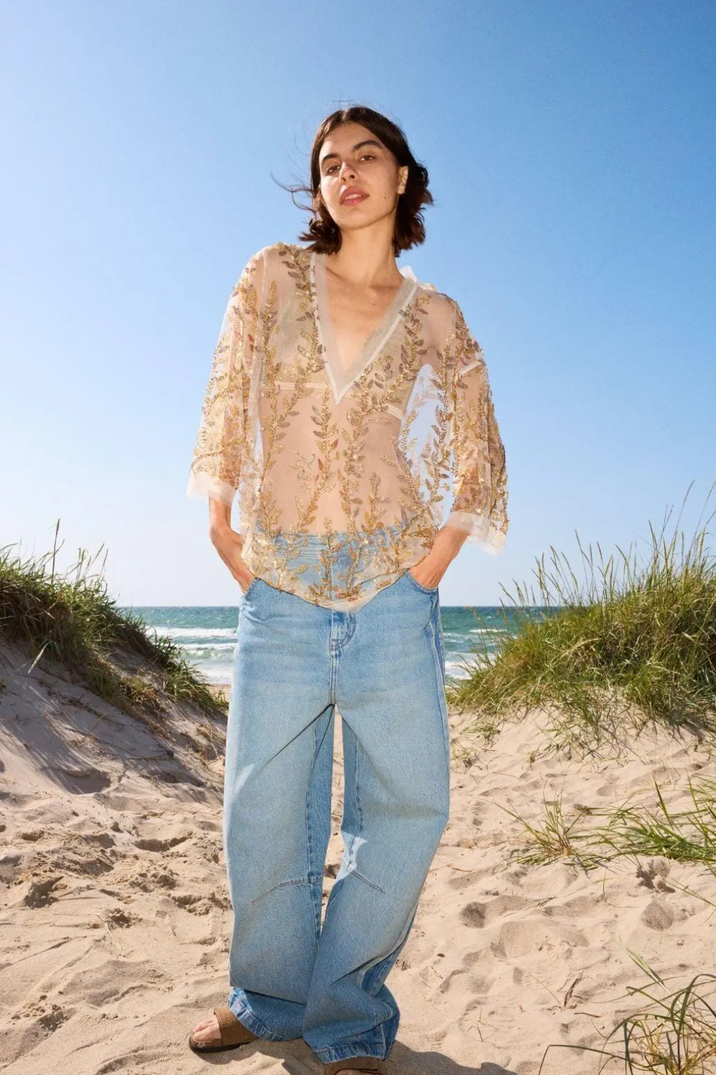 Gylden top fra Munthe, lavet af transparent polyester med gyldne broderier, pailletter og perledetaljer i et bladmønster over hele toppen.