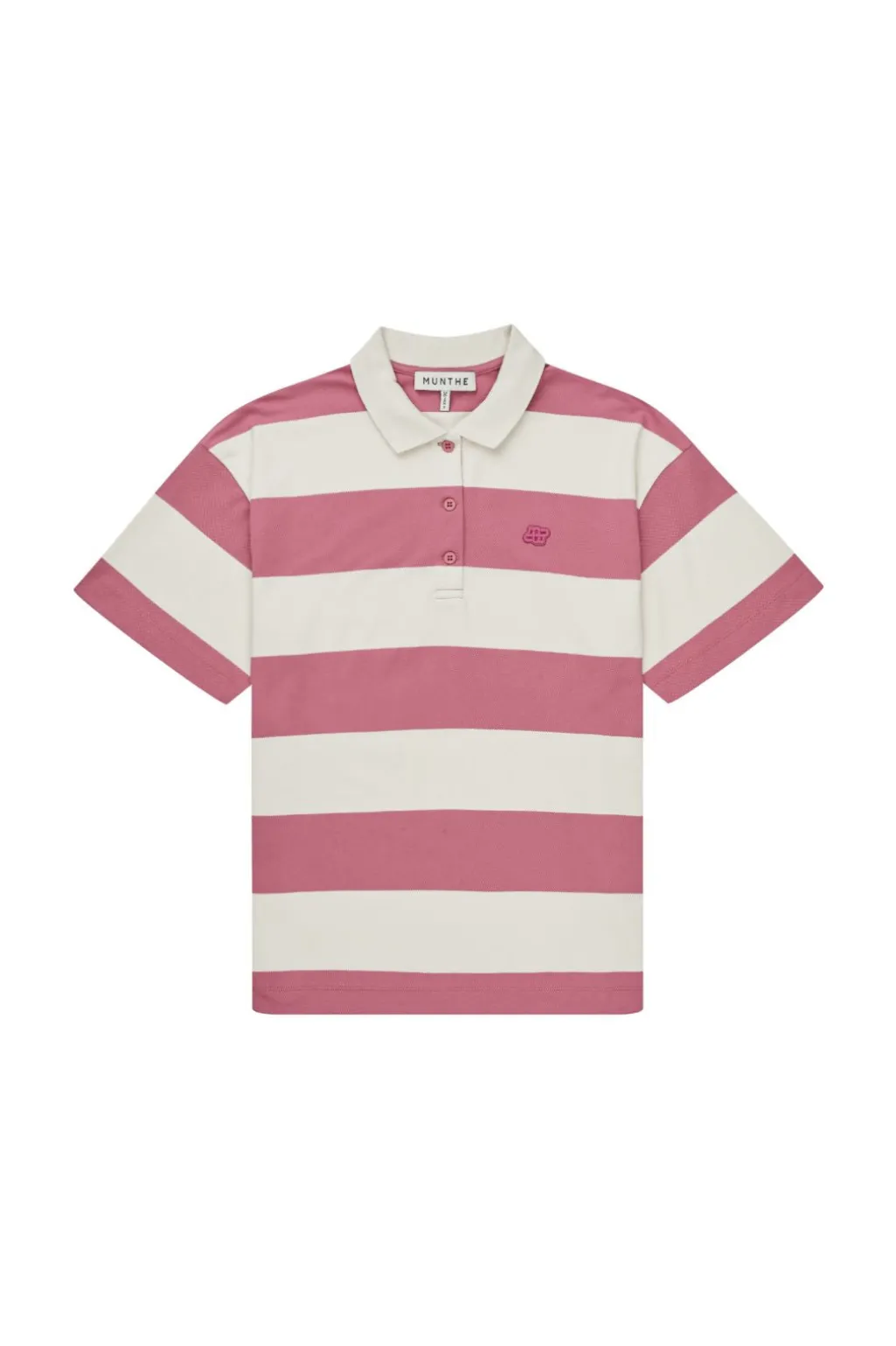 Stribet polo-shirt fra MUNTHE i brede pink og off-white striber. Polo-shirten har en klassisk polo-krave med knapper og et broderet MUNTHE-emblem på brystet.