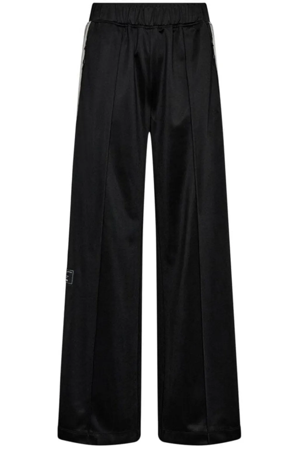 Sorte track pants fra Haute L’Amitié med løs pasform. Bukserne er lavet af 100 % polyester og har hvide striber langs benene samt dekorative syninger.