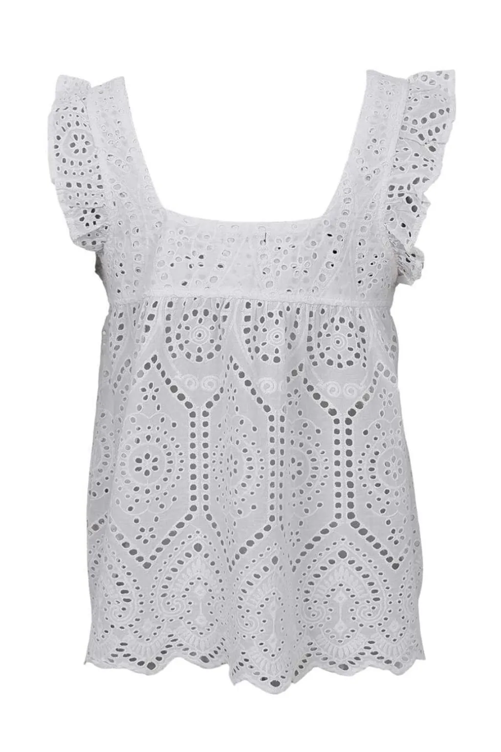 Hvid top fra Black Colour med broderie anglaise-mønster. Toppen er lavet i bomuld med hulmønster og har en firkantet halsudskæring med brede stropper.