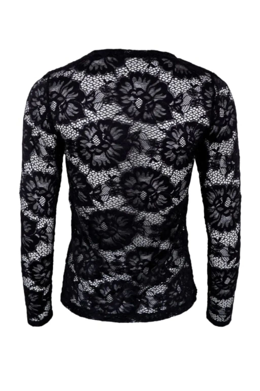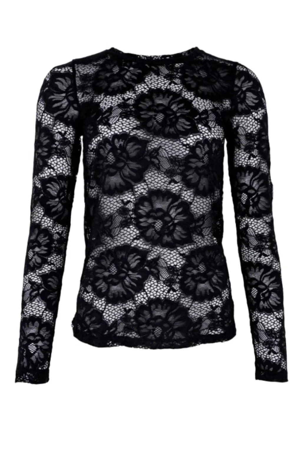 Sort blondebluse fra Black Colour med blomstermønster. Blusen har en rund halsudskæring og er fremstillet i et gennemsigtigt blondemateriale med store blomstermotiver.