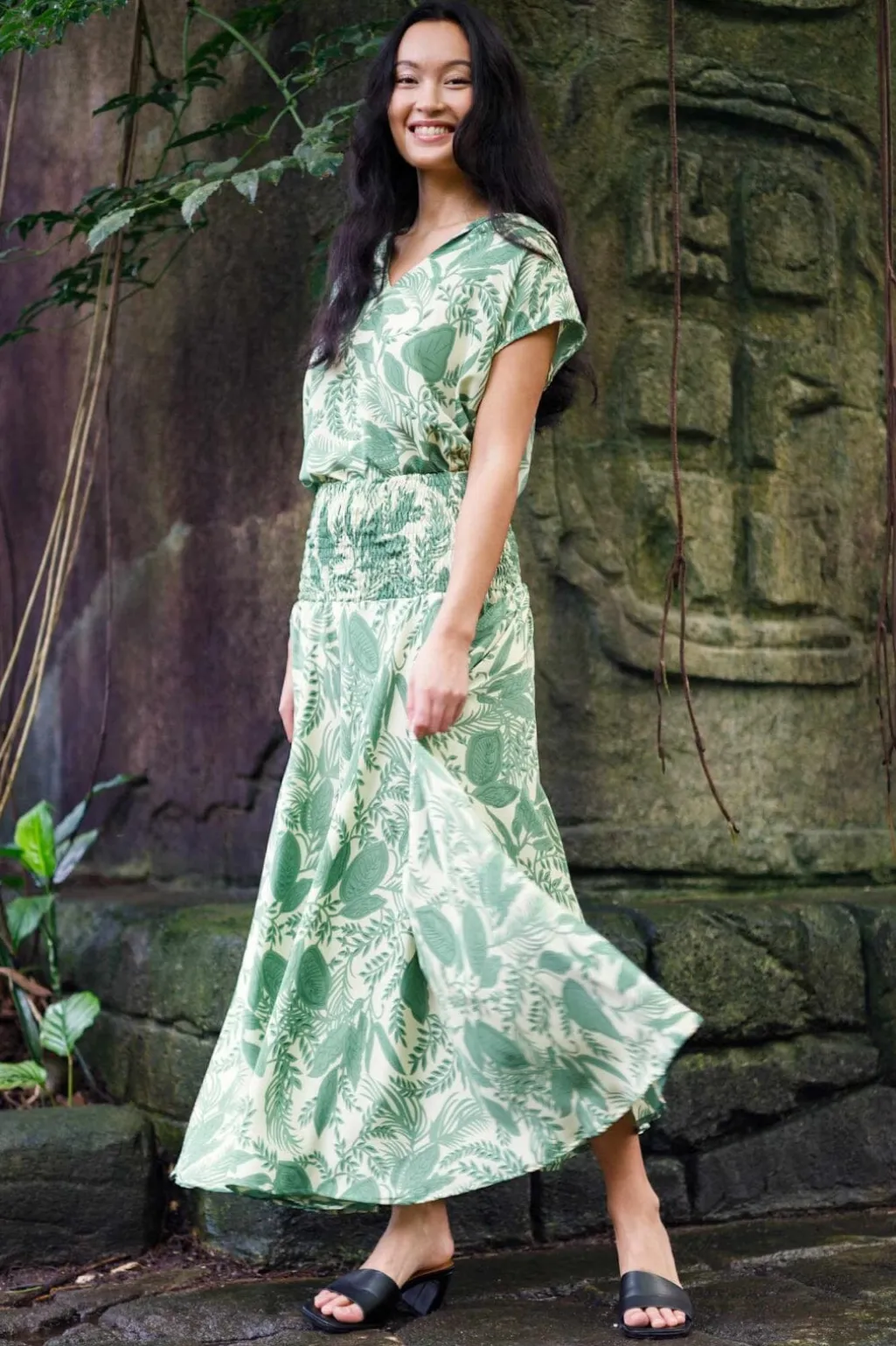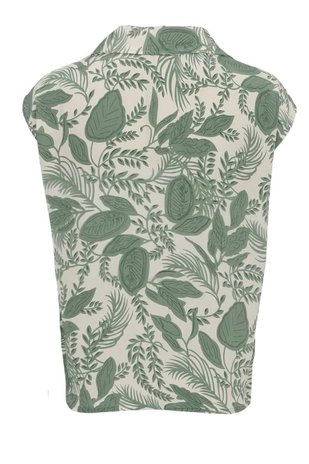 Bluse fra Black Colour i salviegrøn med botanisk mønster. Den har V-hals og er uden ærmer. Mønstret består af blade og planter på en lys baggrund.
