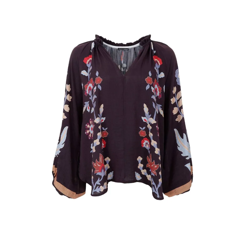 Bluse fra Black Colour i mørkebrun med blomsterprint i røde, blå og beige nuancer. Blusen har bindebånd, broderi og flæser.