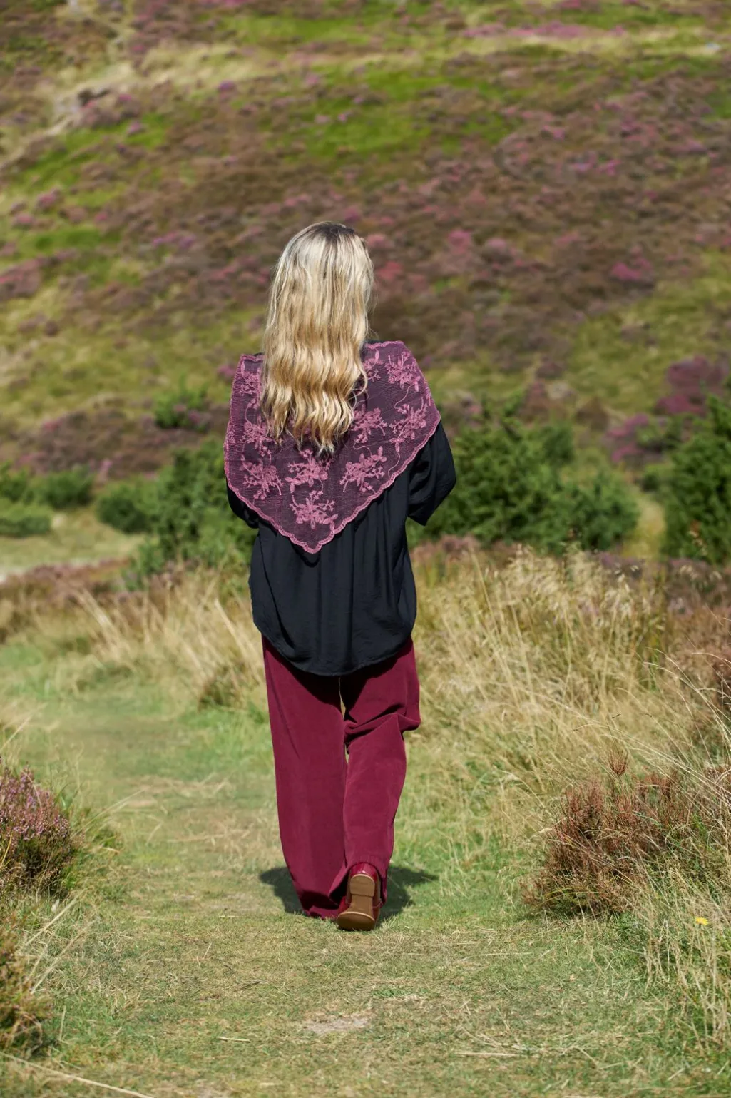 Trekantet tørklæde fra Black Colour i vinrød. Tørklædet har en blondekant med blomstermønster og spidse ender, der giver det et feminint udtryk.