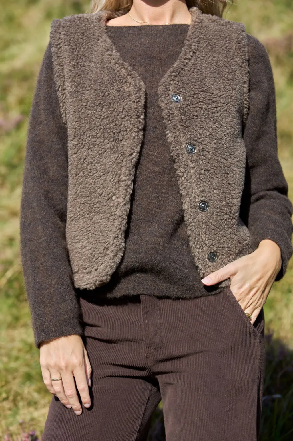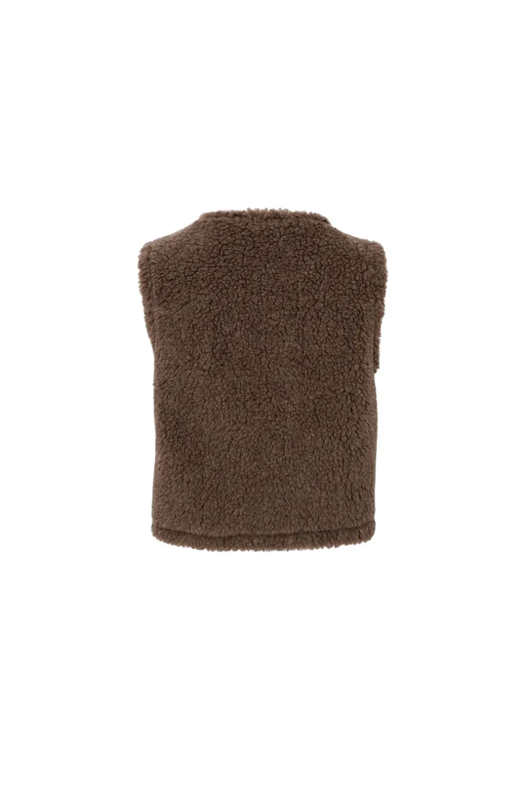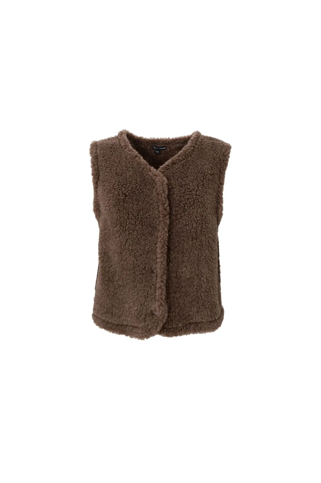 Vest fra Black Colour i taupe. Den bløde teddy-tekstur giver vesten et varmt og behageligt udtryk. V-udskæringen og knaplukningen foran skaber en praktisk og afslappet stil.