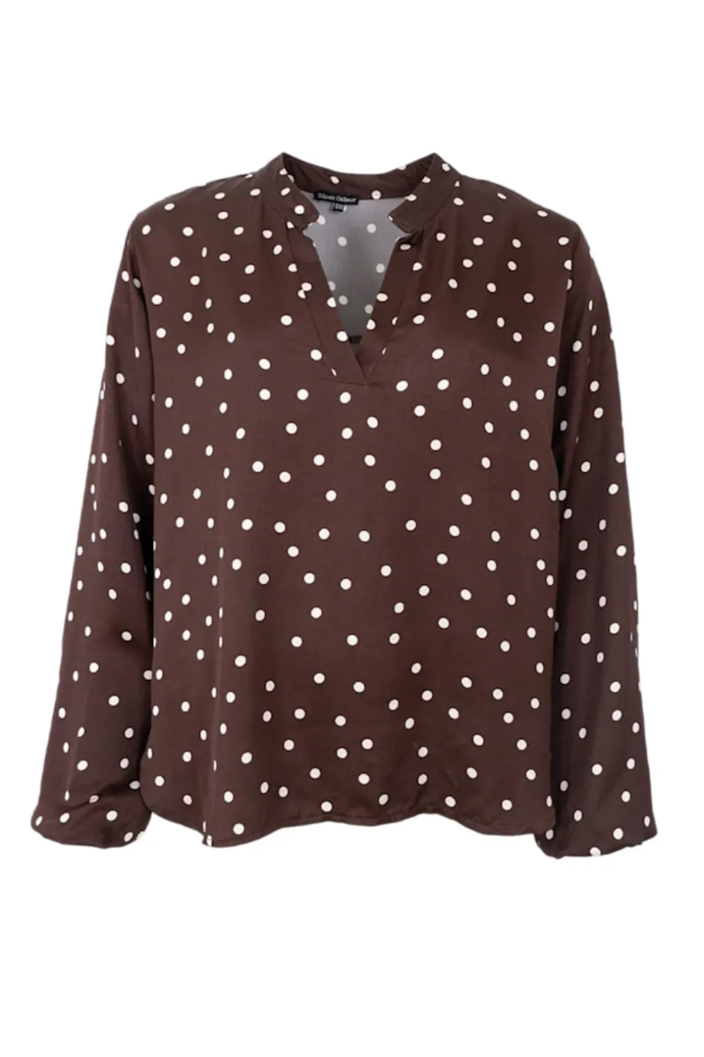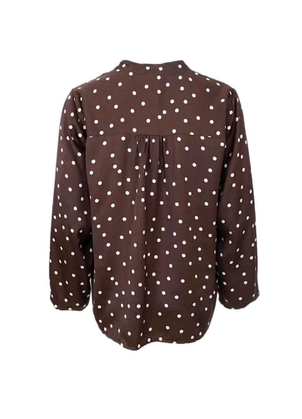 Brun bluse fra Black Colour med hvide polkaprikker. Blusen har lange ærmer og en V-udskæring, og den trækkes over hovedet uden knapper eller lynlås.