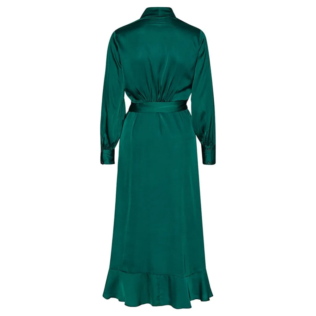 Mørkegrøn slå-om-kjole med lange ærmer og skjortekrave. Kjolen har en rynket kant forneden og bindebånd i taljen med flæsekant.