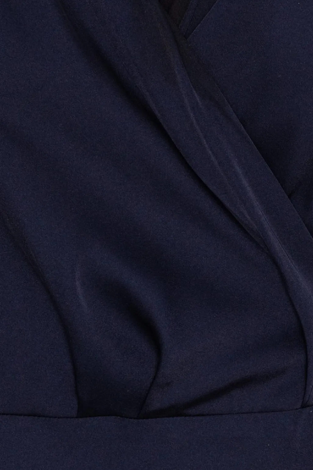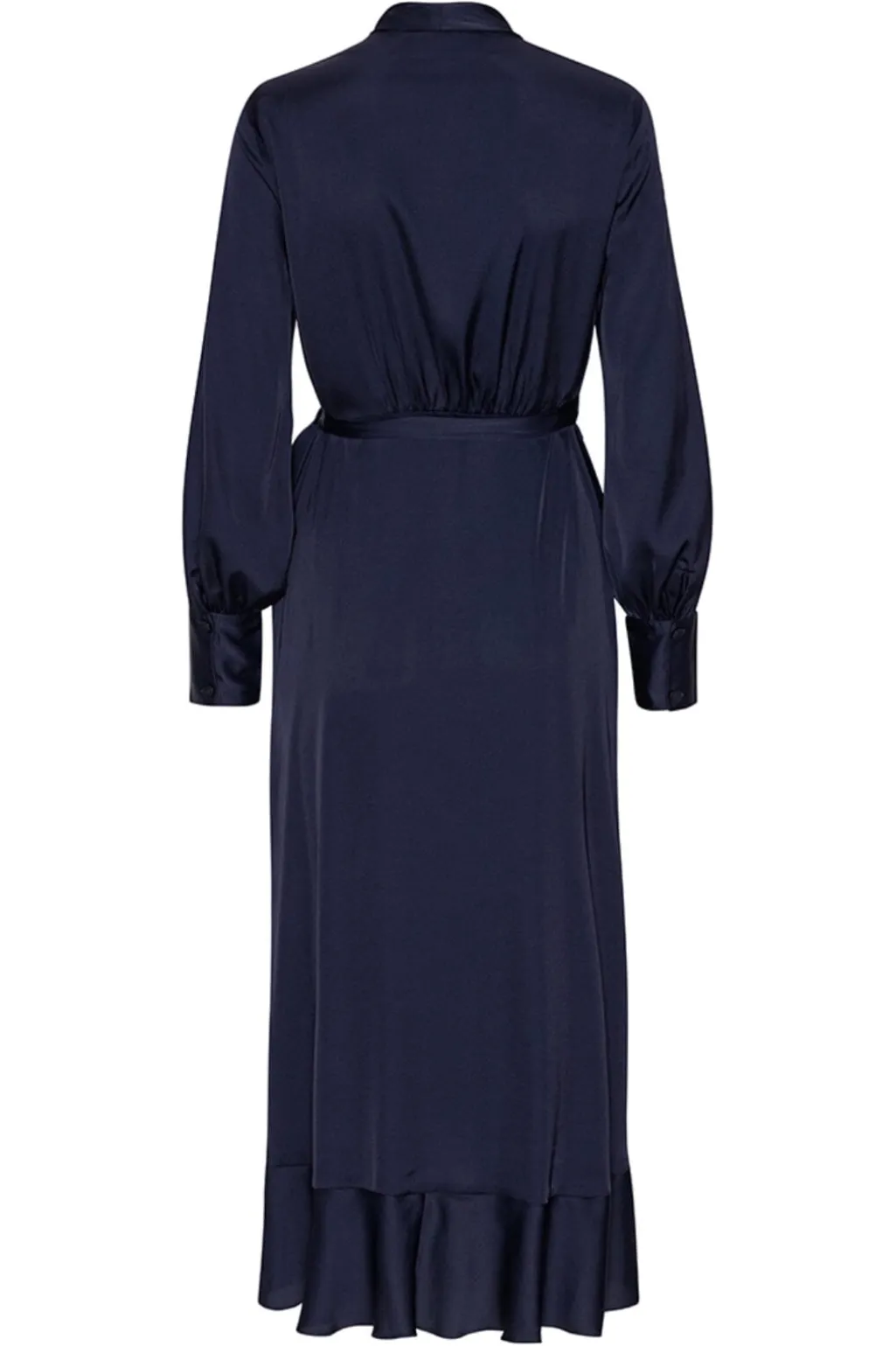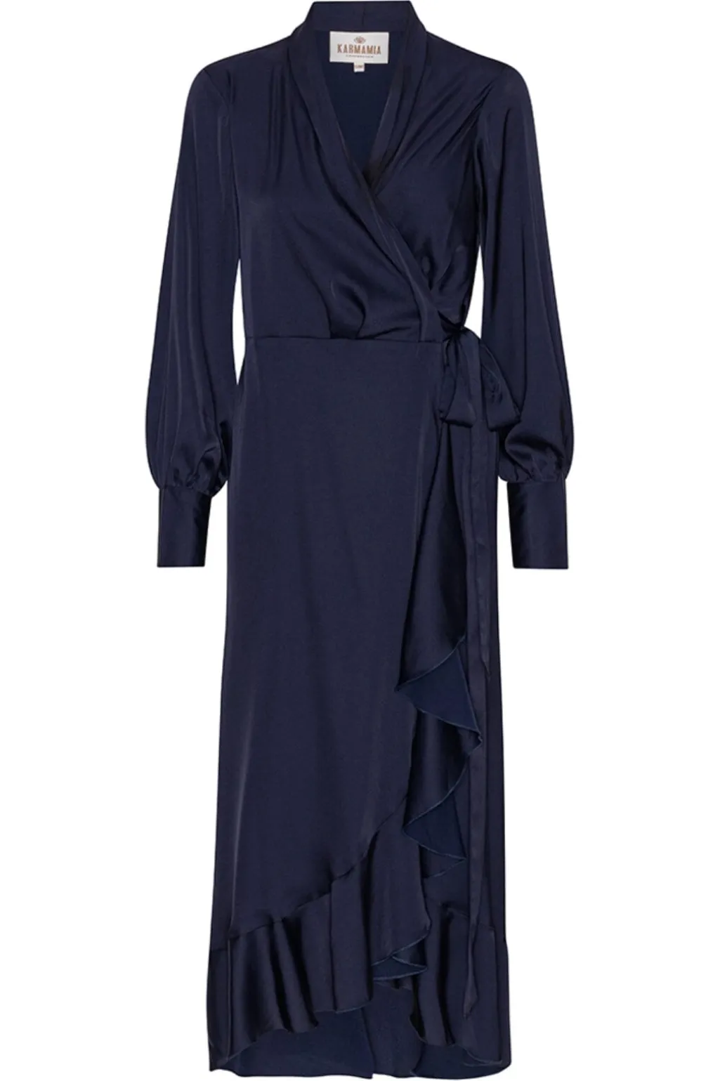 Mørkeblå slå-om-kjole fra Karmamia i satin med flæsekant forneden. Kjolen har lange ærmer med balleffekt og V-udskæring.