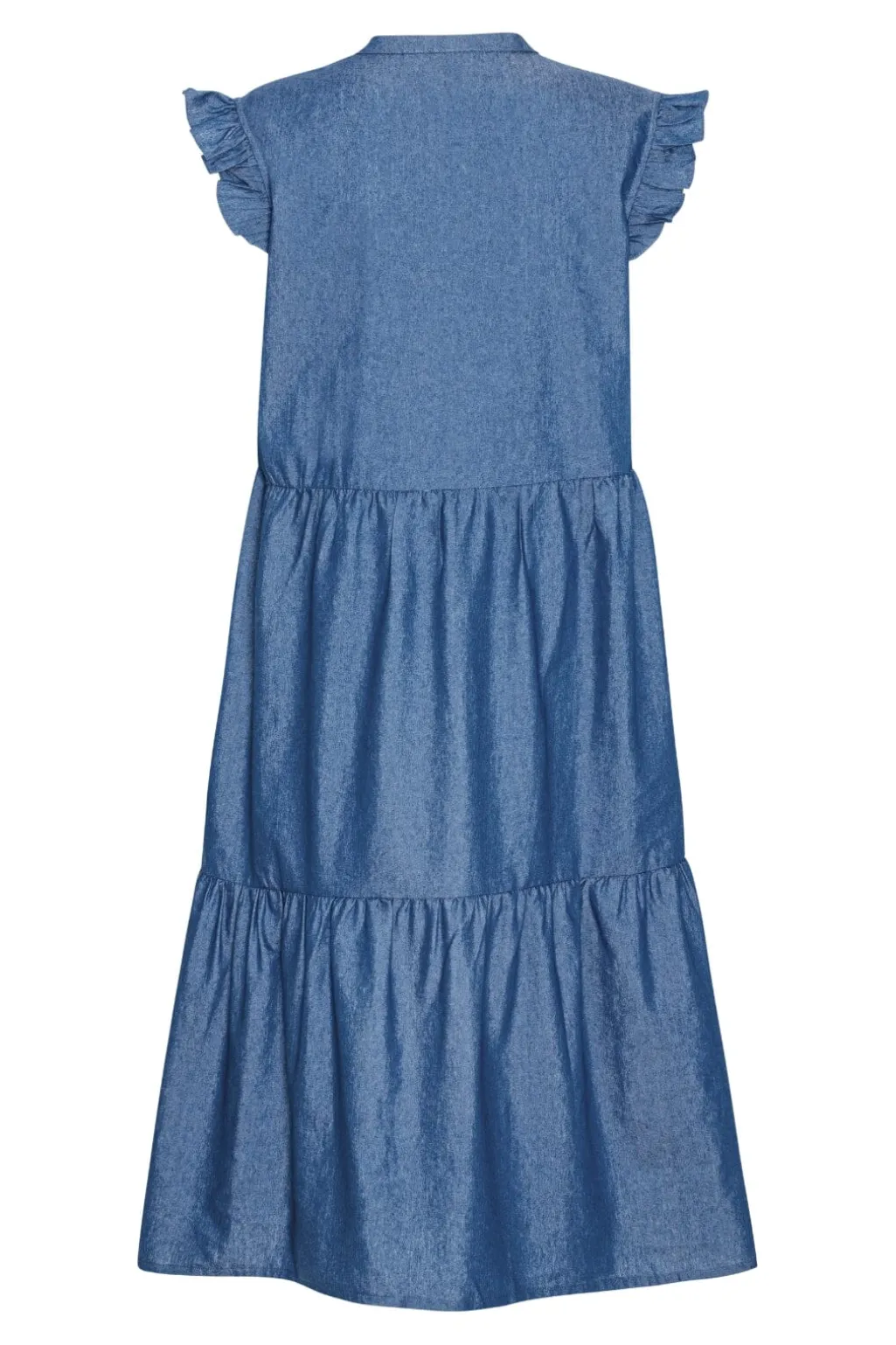 Lang kjole fra Continue i medium blå. Kjolen har v-udskæring, rynkede ærmer og et lagdelt design med flydende fald fra taljen og ned.