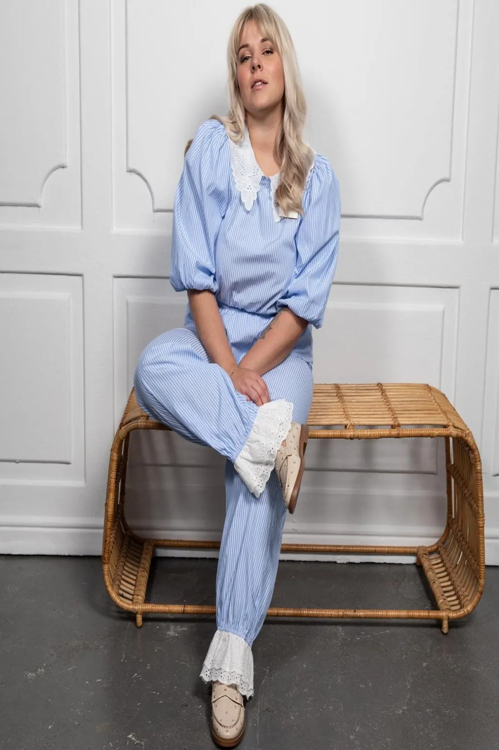 Lyseblå bukser med striber fra Stories From The Atelier. Bukserne har ankellængde med elastik og blondeafslutning, hvilket giver et feminint præg.