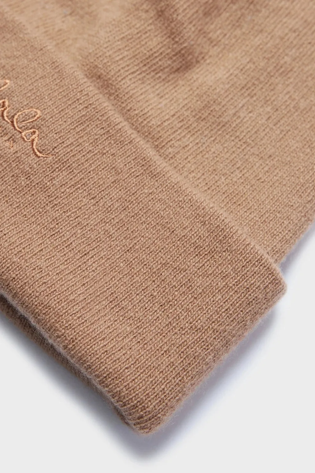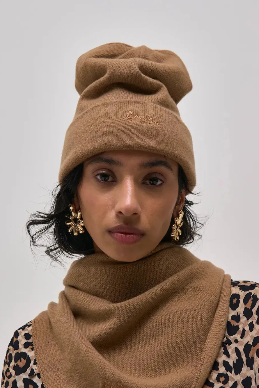 Beanie fra Lala Berlin, lavet af en cashmere-blanding i brune og beige nuancer. Huen har et broderet logo på fronten.