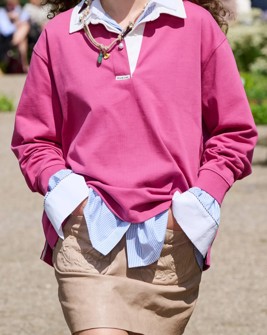 Langærmet polo-trøje fra Munthe i en pink-lilla bærfarve. Trøjen har hvide detaljer på kraven og manchetterne.