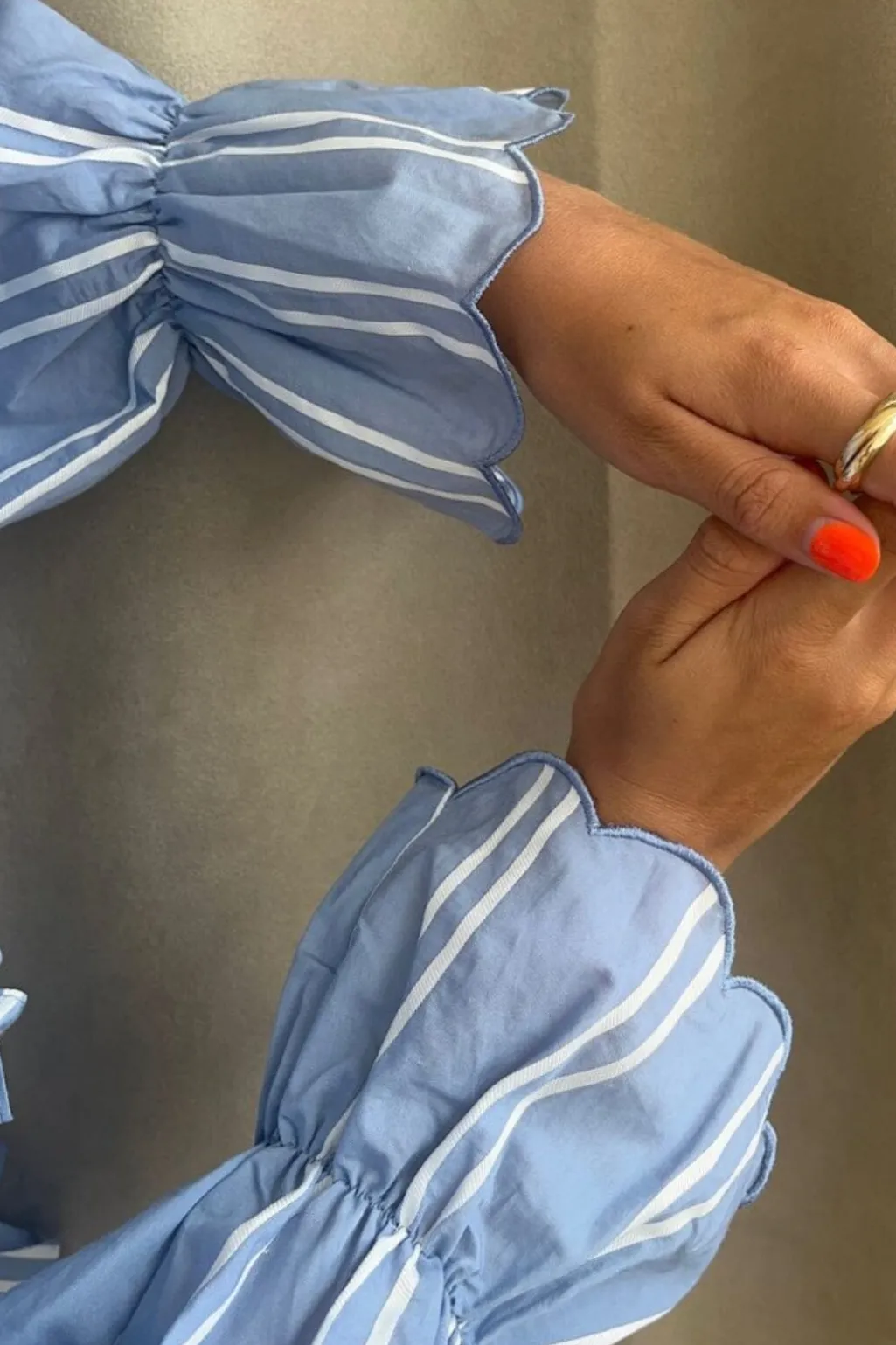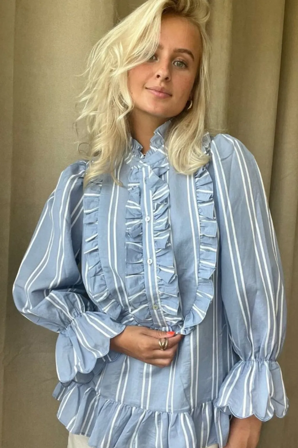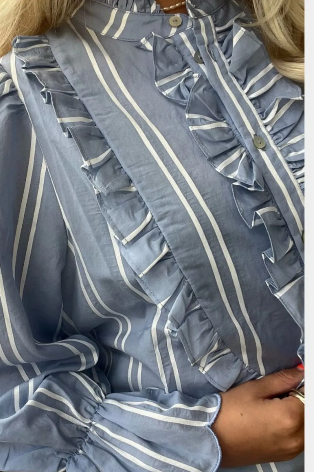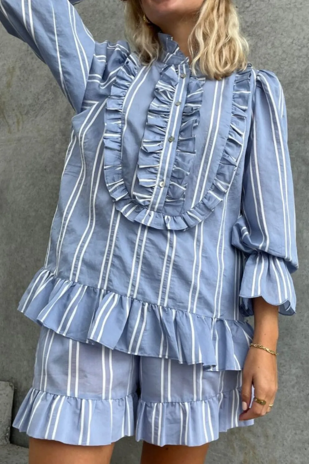 Lyseblå top fra Stories From The Atelier by Copenhagen Shoes med striber og flæser. Toppen har høj hals, 3/4 ærmer og knapper som lukning.