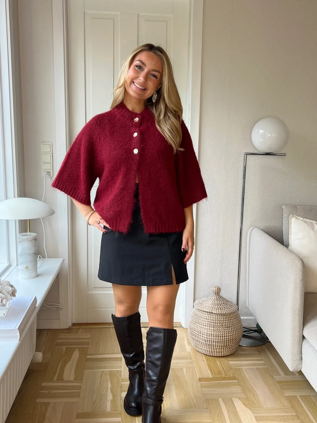 Mørkerød cardigan fra Neo Noir med fluffy strikket tekstur. Den løse pasform med korte ærmer og høj hals giver god bevægelsesfrihed til både hverdag og fest.