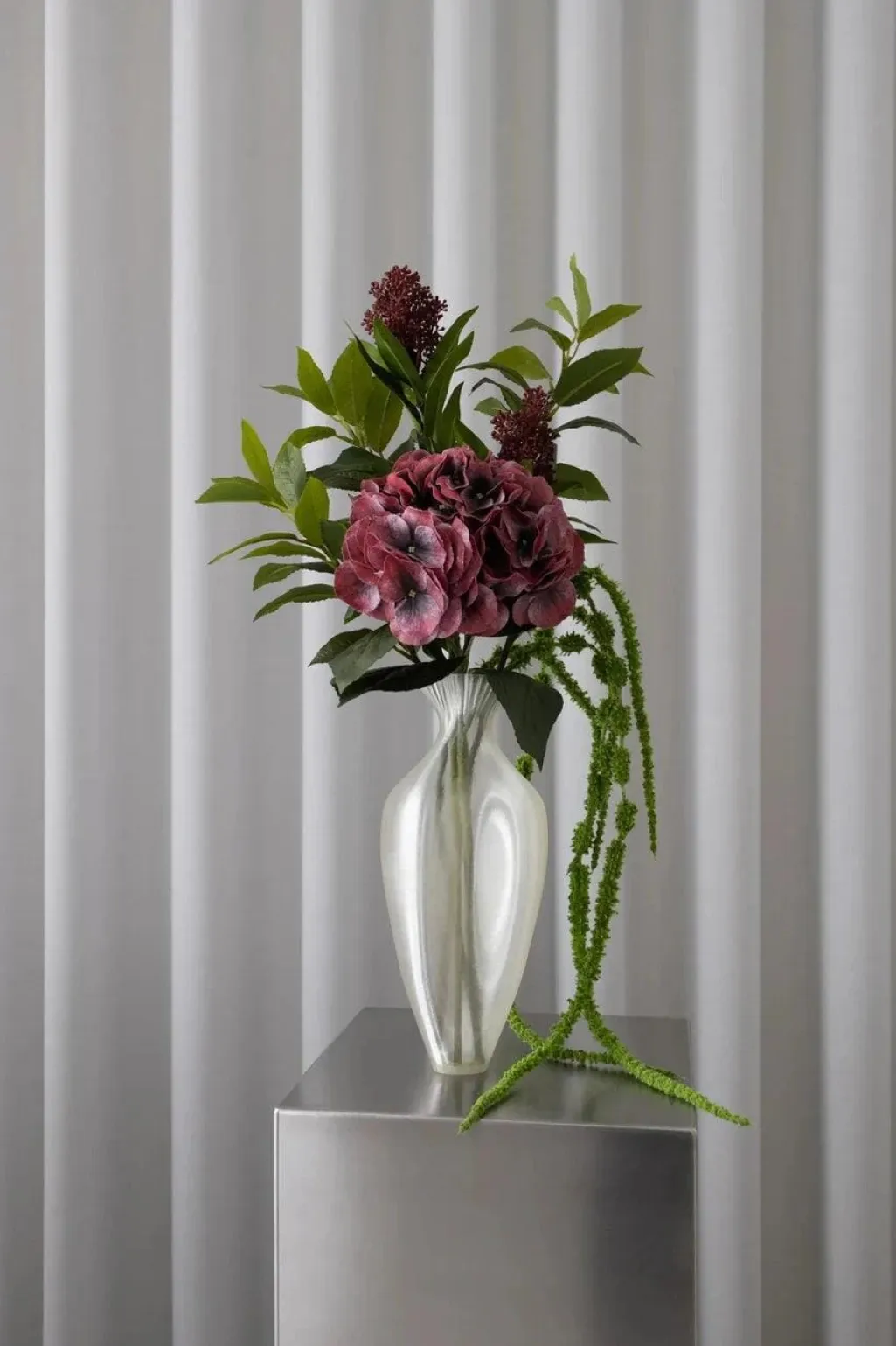 Præsenterer vores Berry Bliss Bouquet – en livlig blomsteropsats omhyggeligt fremstillet med latex for et autentisk og naturtro udseende.Buketten indeholder en fantastisk samling af grønne og blomstrende blomster. Denne buket indeholder:- Amaranthus 6 Fork: Den grønne amaranthus stråler med sine unikke, hængende blomsterklaser og friske grønne nuancer, der tilføjer en moderne og livlig elegance.- Grønne Blade: Det frodige grønne monstera-blad fanger opmærksomheden med sit dristige, splittede design og rige smaragdgrønne farve, hvilket bringer et livligt og forfriskende strejf af naturens elegance til enhver opsats.- Hortensia – Rød: Den røde hortensia stråler med sine fyldige blomster og bløde røde nuancer, hvilket tilføjer en delikat og elegant tone.- Skimmia Bær – Rød: Den røde plante stråler med sine friske grønne blade og elegante røde blomster, hvilket tilføjer et rent og harmonisk touch.Disse kunstige, naturtro blomster bringer varig elegance til dine omgivelser. Omfavn naturens varme og glæde uden behov for vedligeholdelse. Forhøj dit hjem
