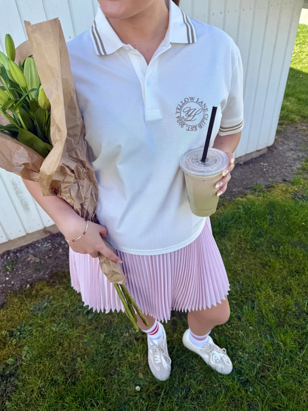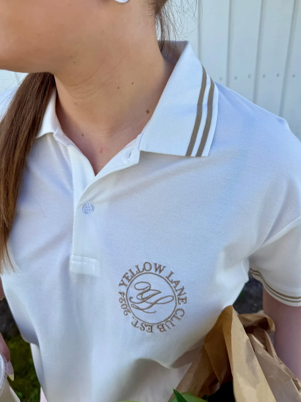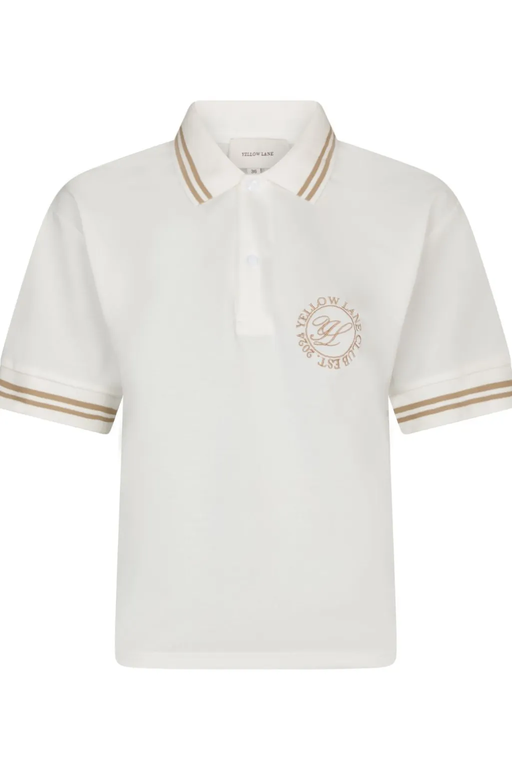 Off-white polo fra Yellow Lane med brune striber på kraven og ærmerne. Et broderet logo pryder venstre side af brystet med teksten YELLOW LANE og EST. 1994.