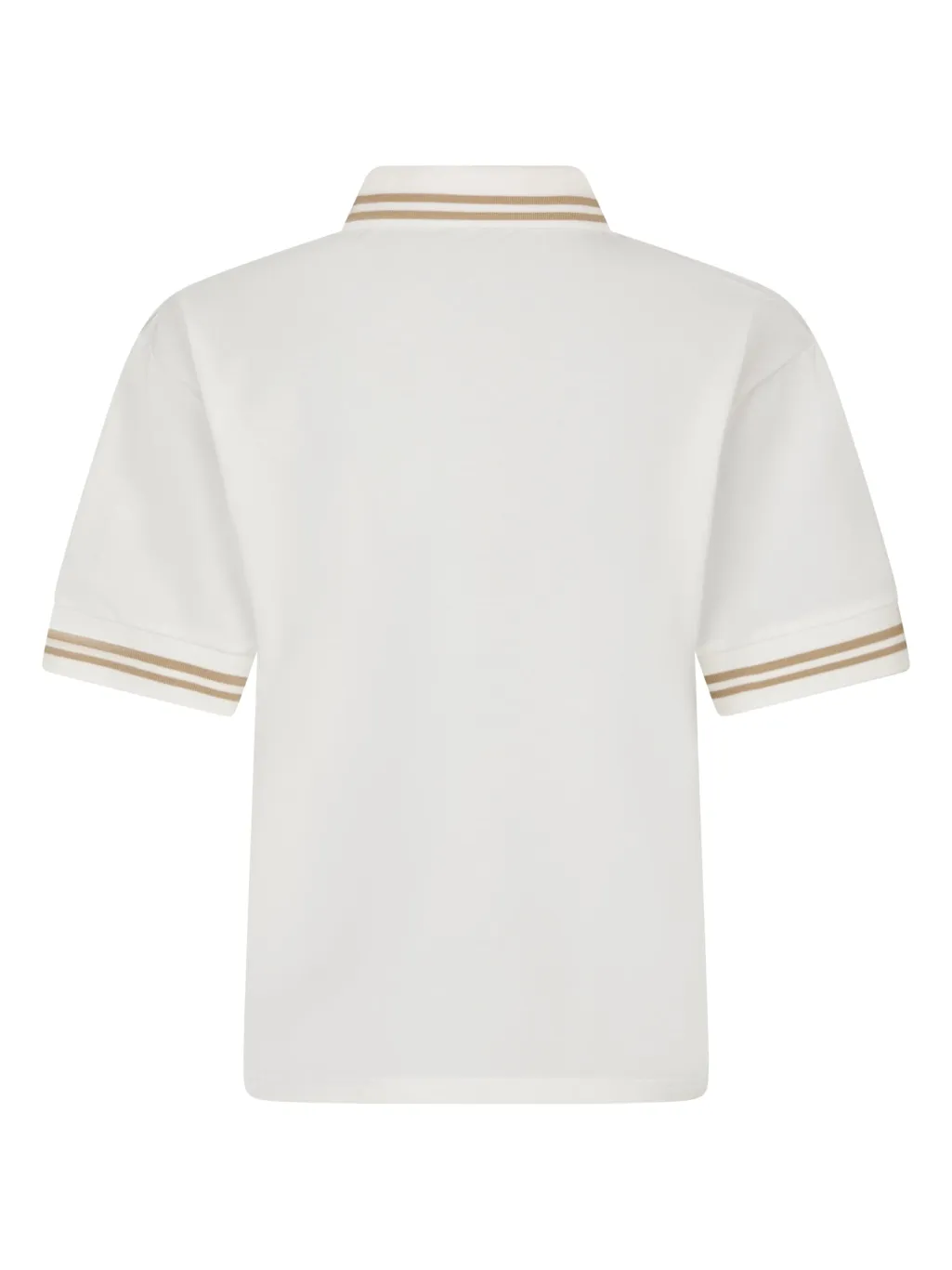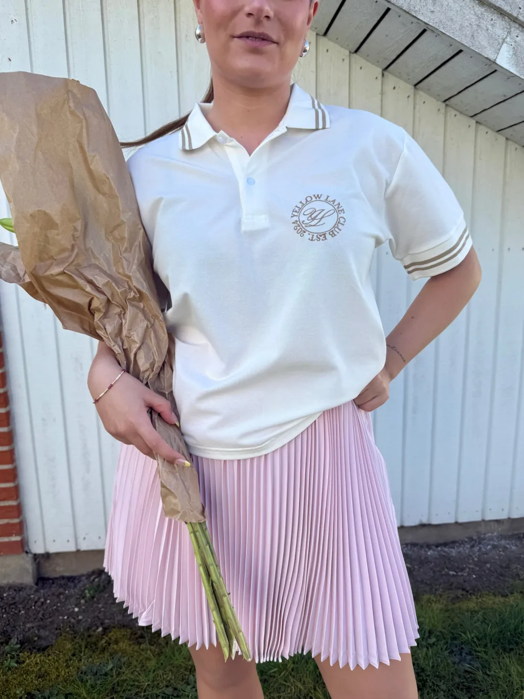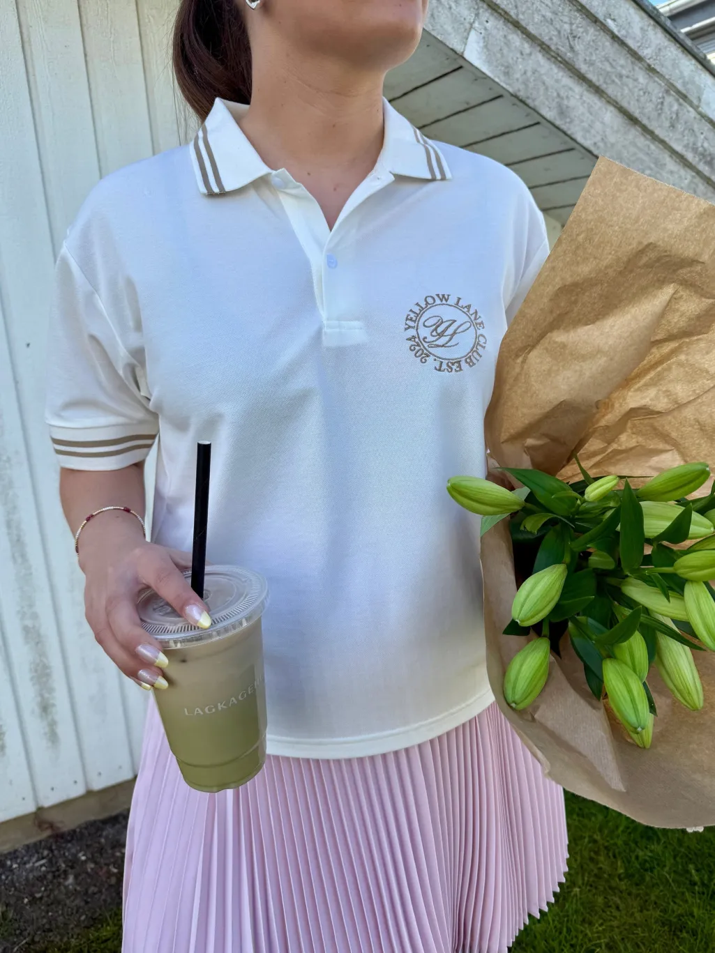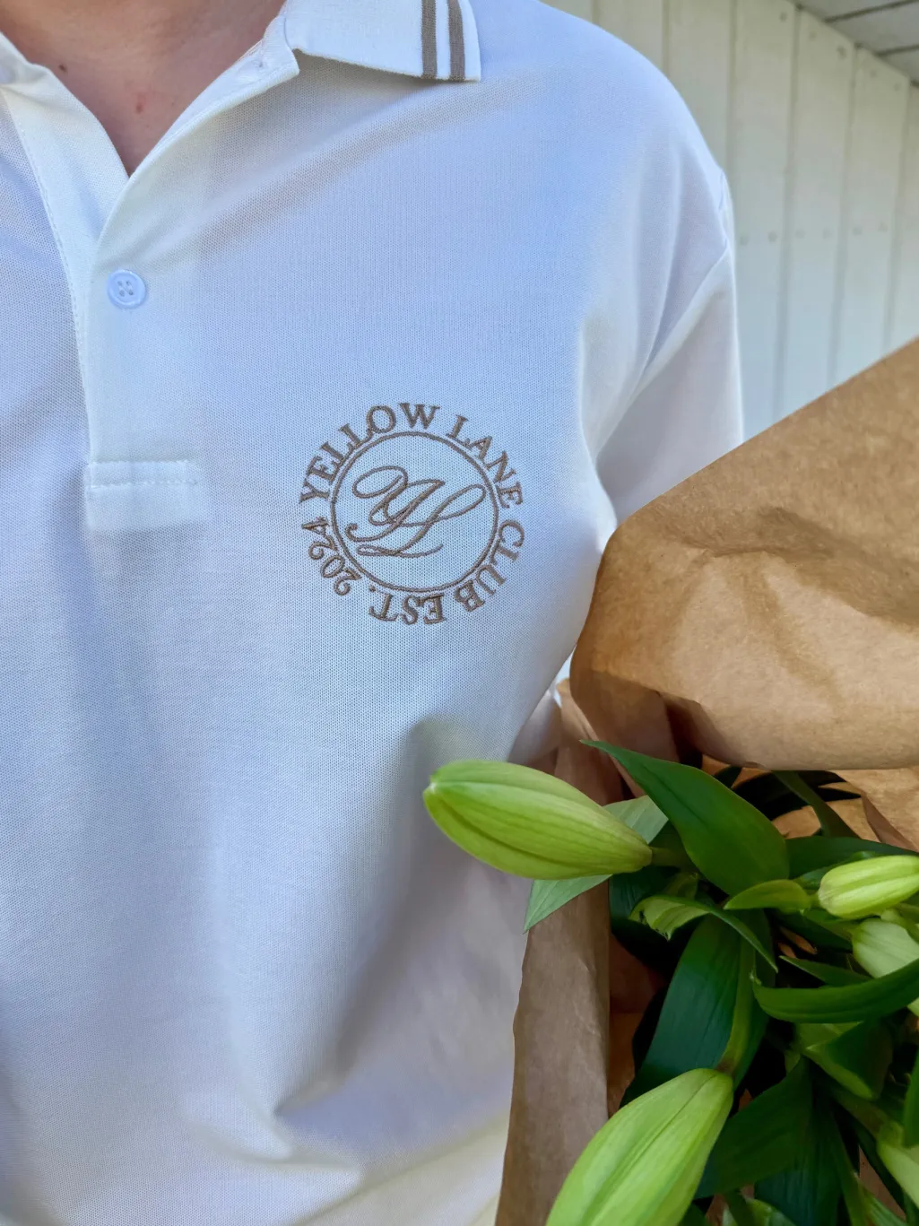 Off-white polo fra Yellow Lane med brune striber på kraven og ærmerne. Et broderet logo pryder venstre side af brystet med teksten YELLOW LANE og EST. 1994.