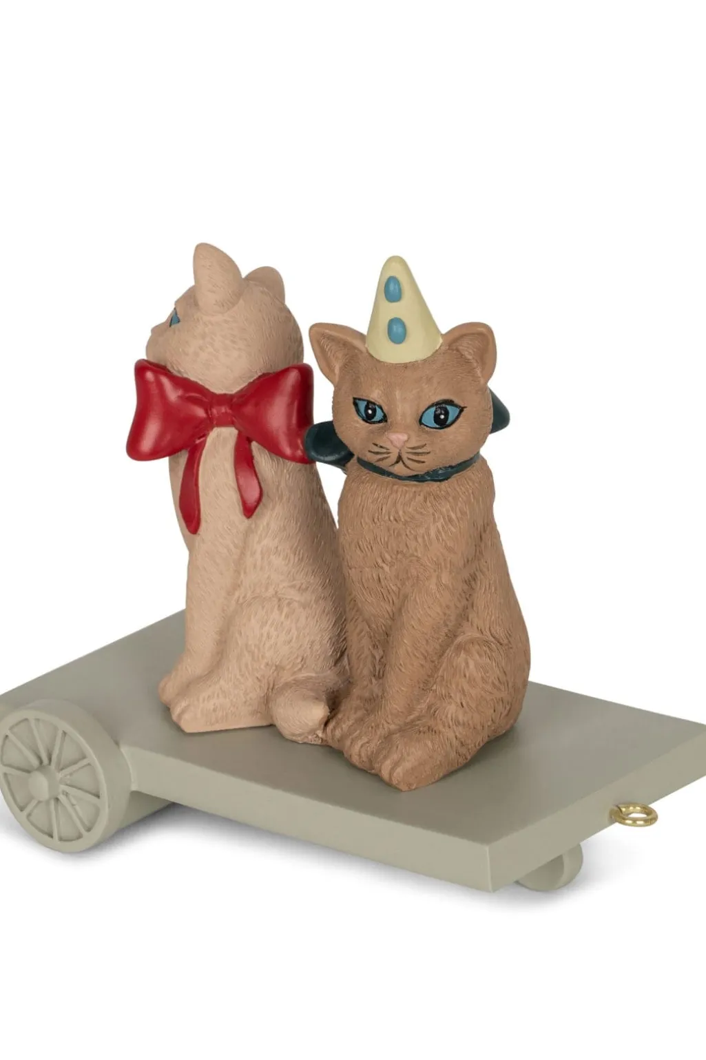 Et dekorativt fødselsdagstog fra Konges Sløjd med figurer som kat, svane, panda og klovn. Toget har lysestager i metal og er CE-mærket til sikker brug omkring børn.
