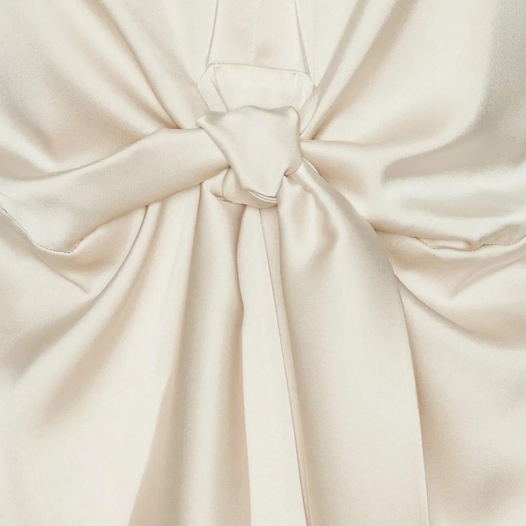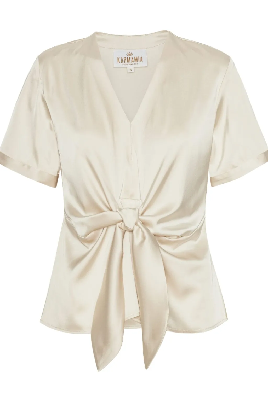 Bluse fra Karmamia i en lys porcelænshvid nuance. Den korte model har v-hals og en knude ved taljen, der skaber form. Stoffet har en silkeagtig overflade med flot fald.