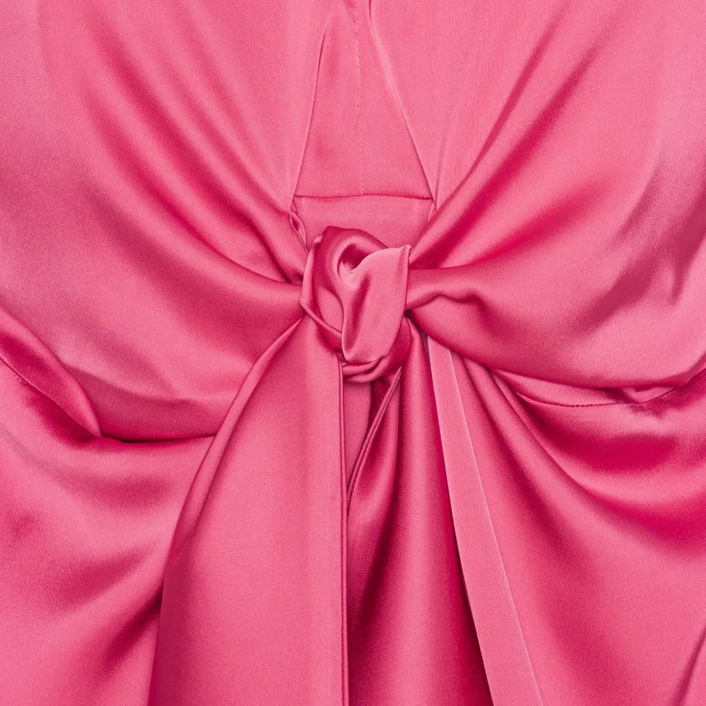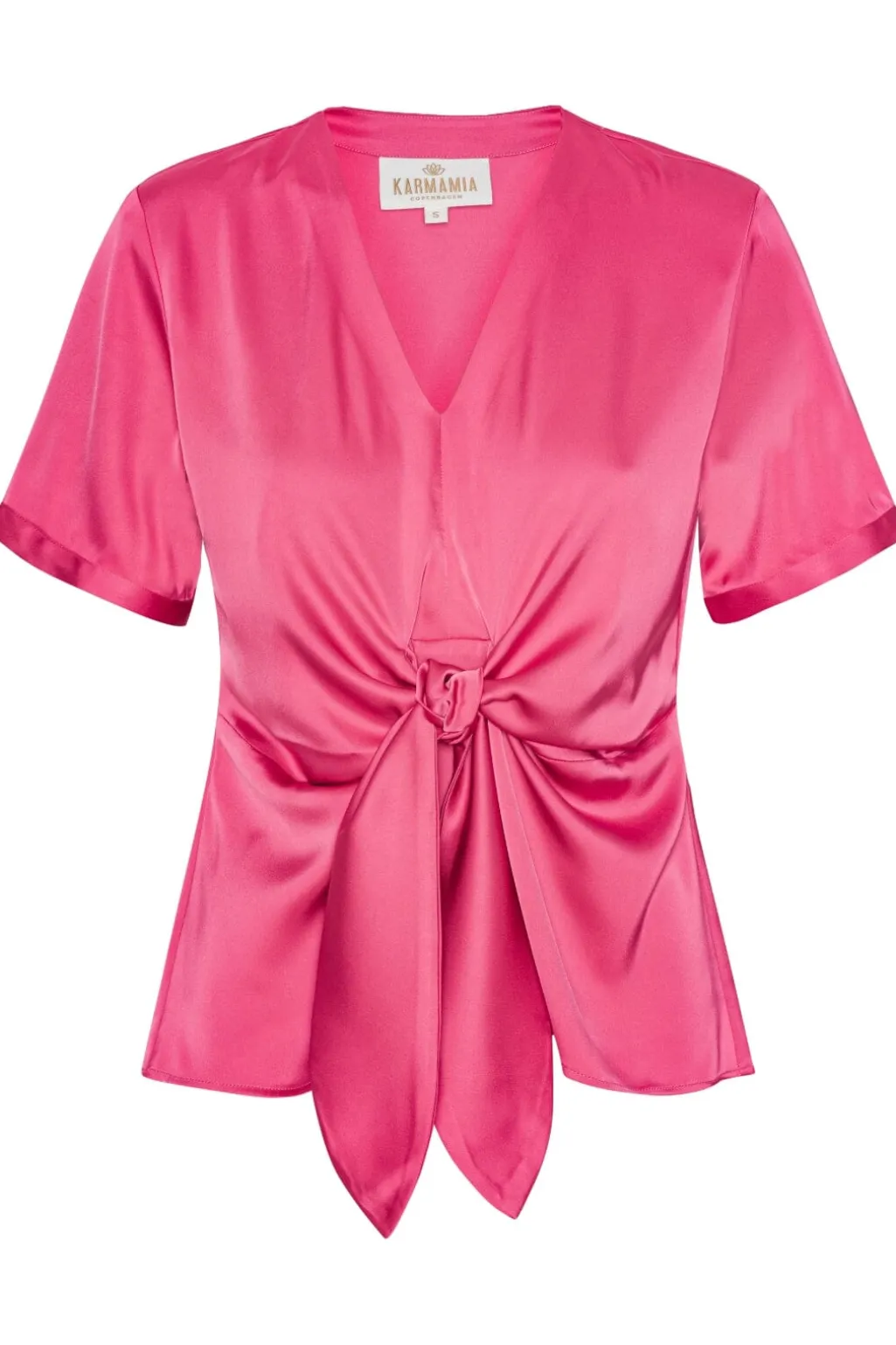 Pink bluse fra Karmamia med korte ærmer og knudedetalje ved taljen. Blusen har en blank overflade og en v-udskæring foran.
