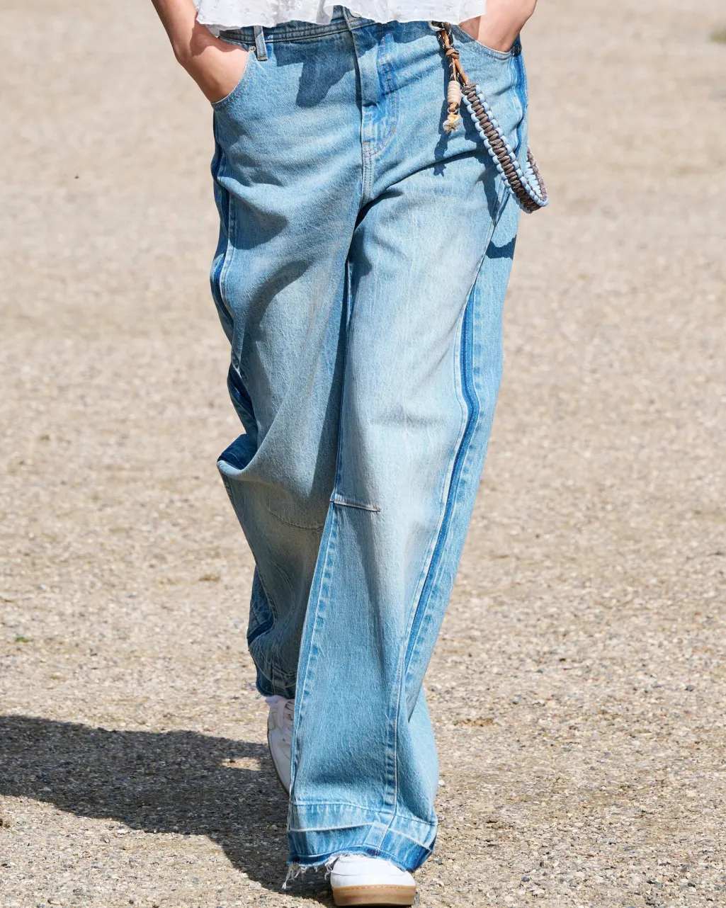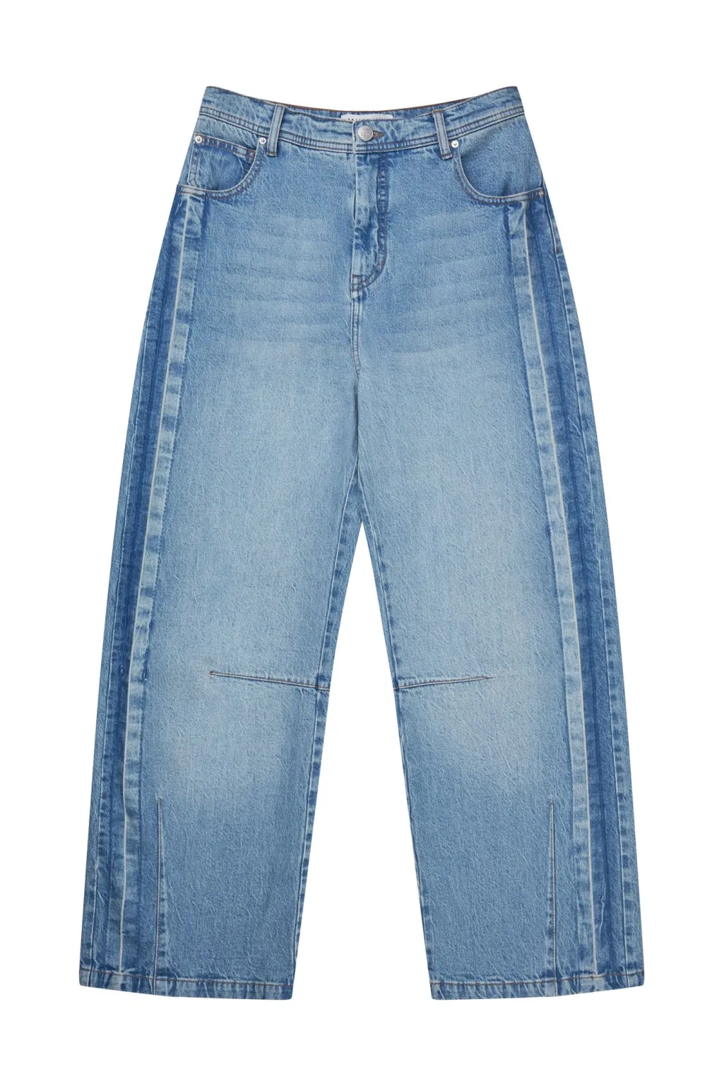 Blå jeans fra Munthe med bred, afslappet pasform. Bukserne har høj talje, gulvlang længde og stribede paneler i siderne i mørkere denim.