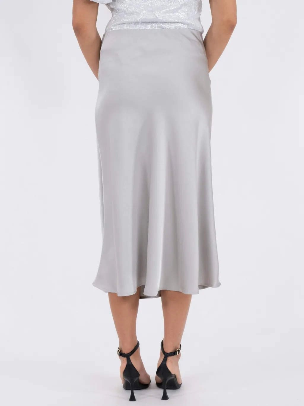 Sølvfarvet nederdel fra Neo Noir i blødt satinmateriale. Den har en A-linjeformet silhuet med skrå skæring og midi-længde, der giver et rent og stilrent udtryk.