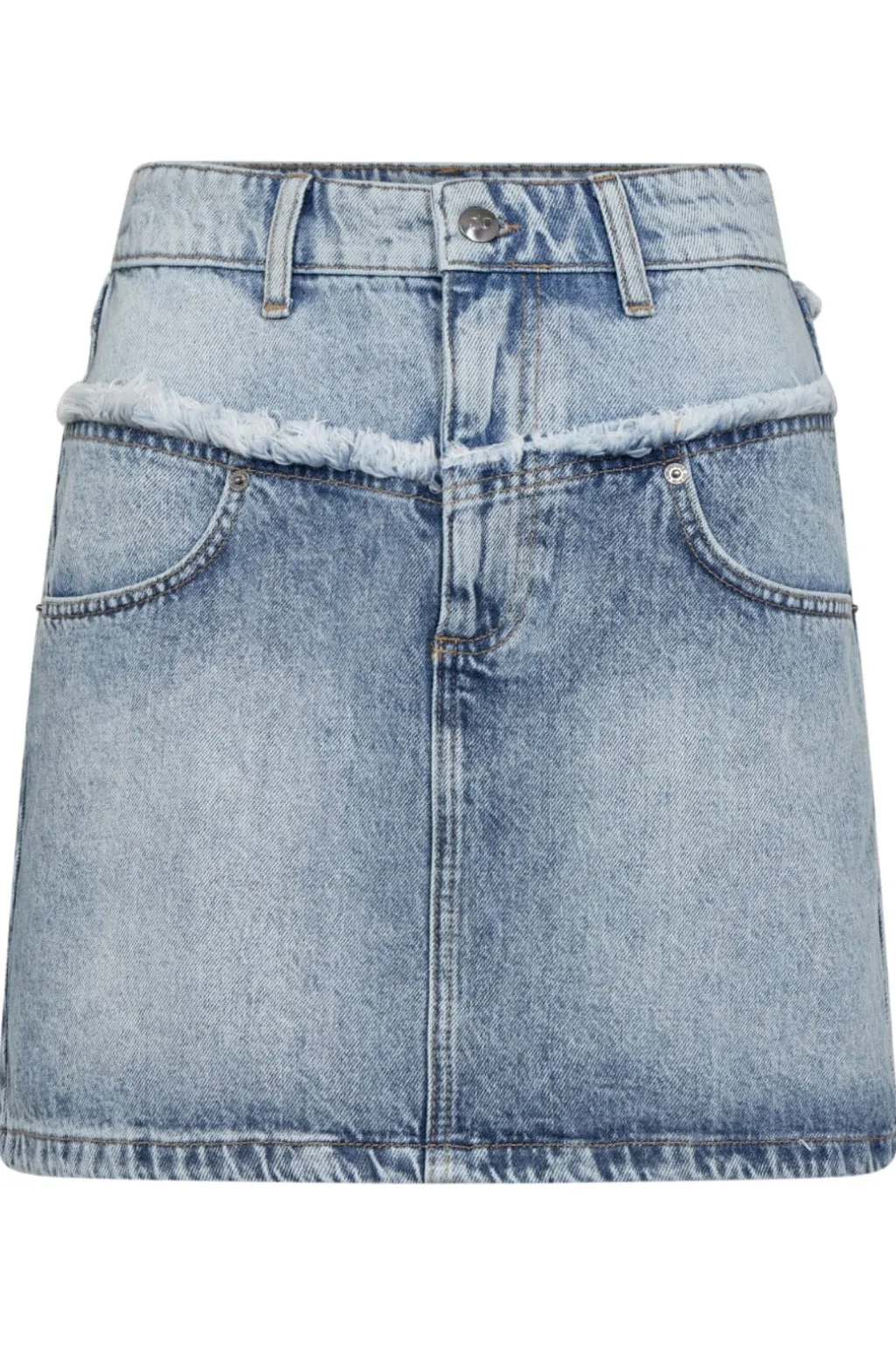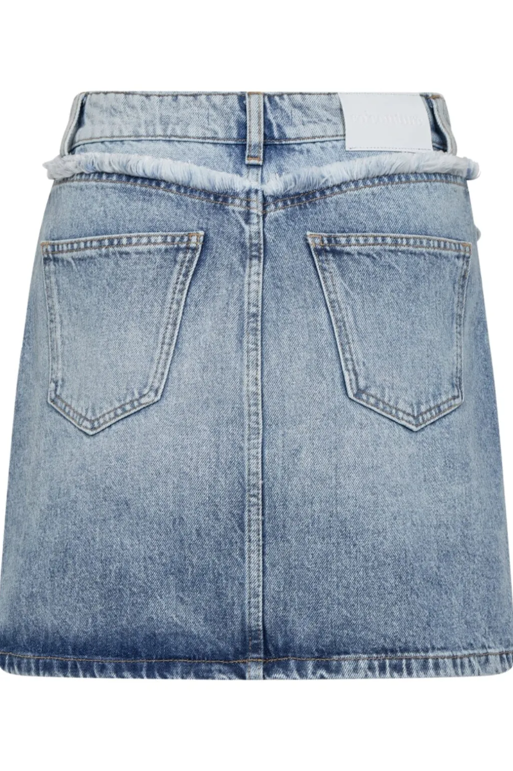 Denimnederdel fra Co´Couture i en lys, falmet vask. Den har frayed kant ved taljen og praktiske lommer både foran og bagpå.