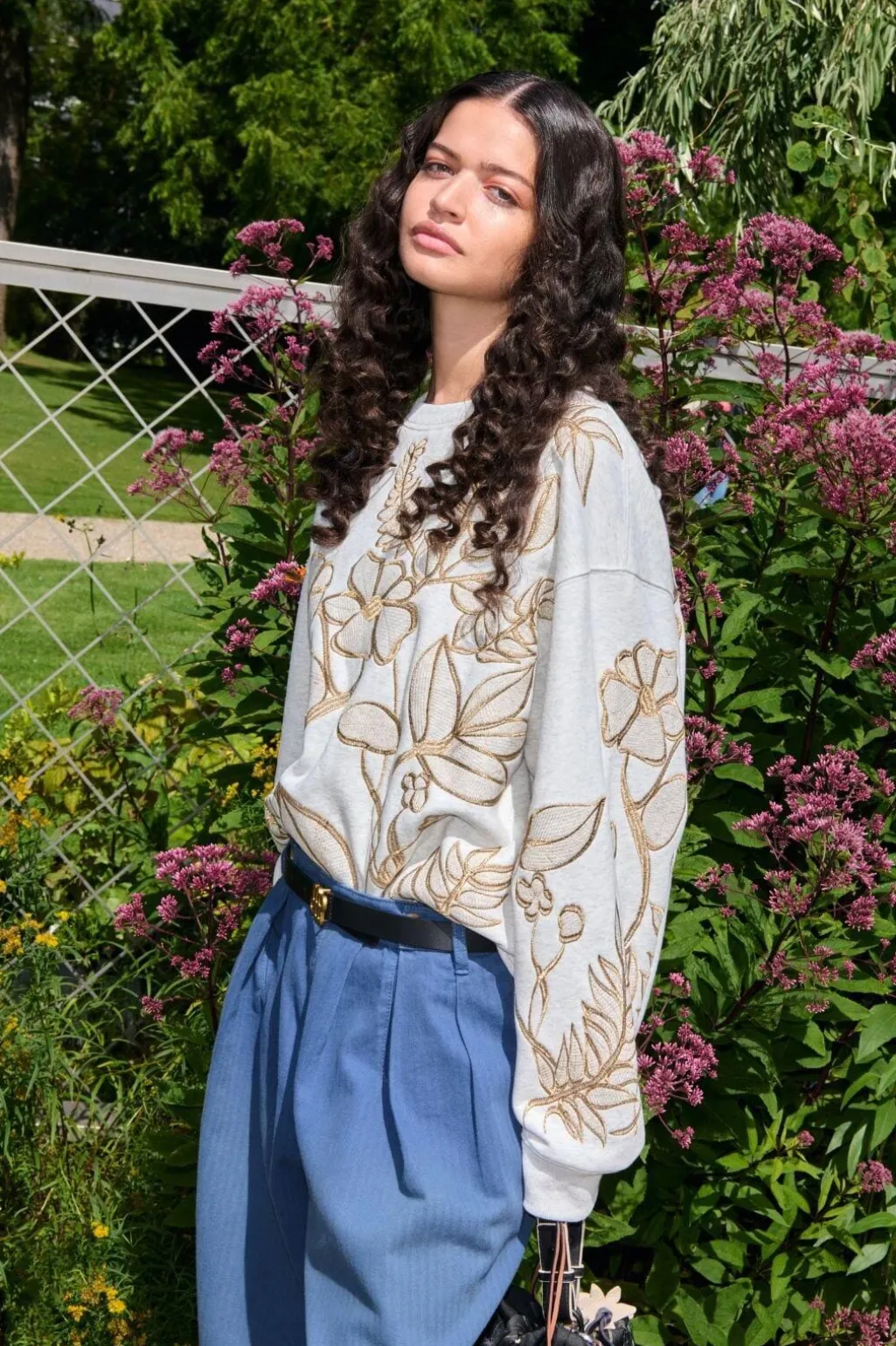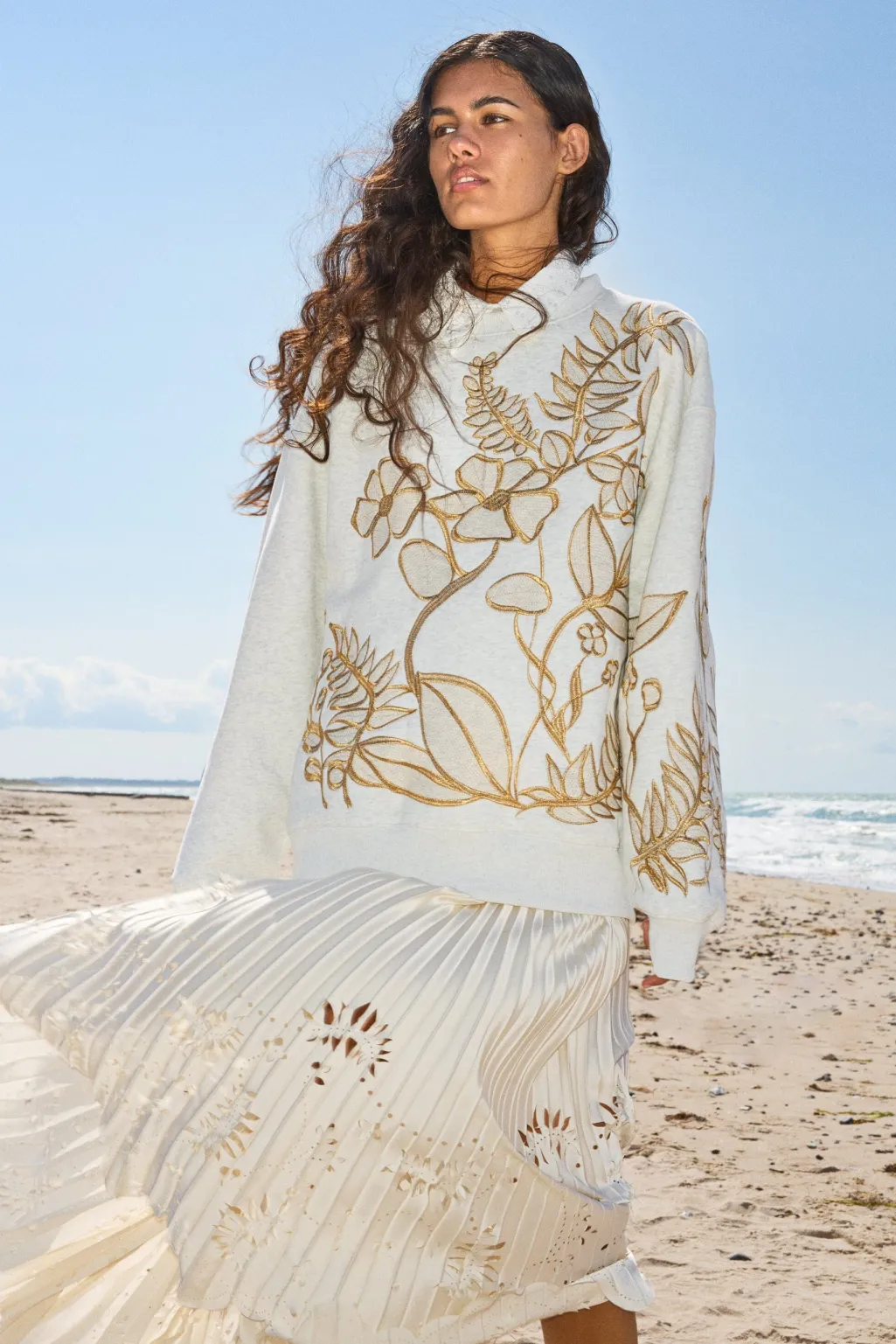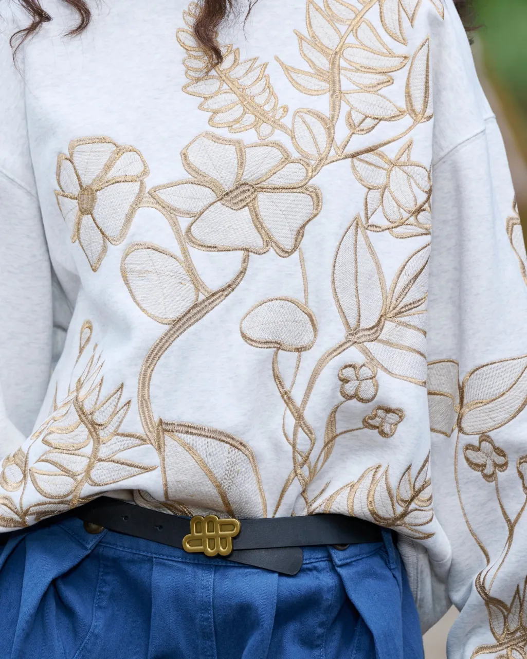 Lys grå sweatshirt fra Munthe med blomstret broderi i guldtoner på forsiden og ærmerne. Oversize-pasform med rund hals og lange ærmer.