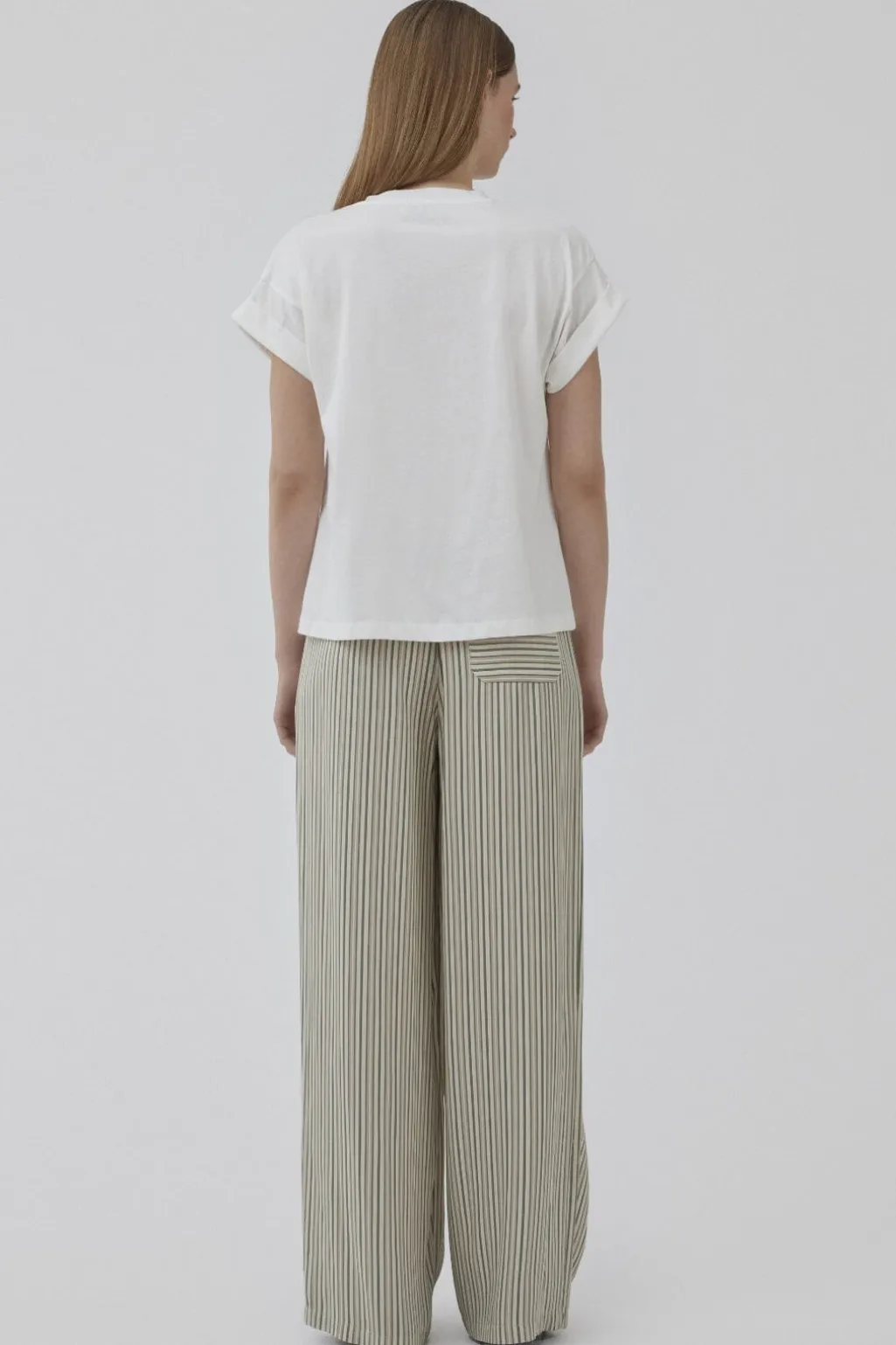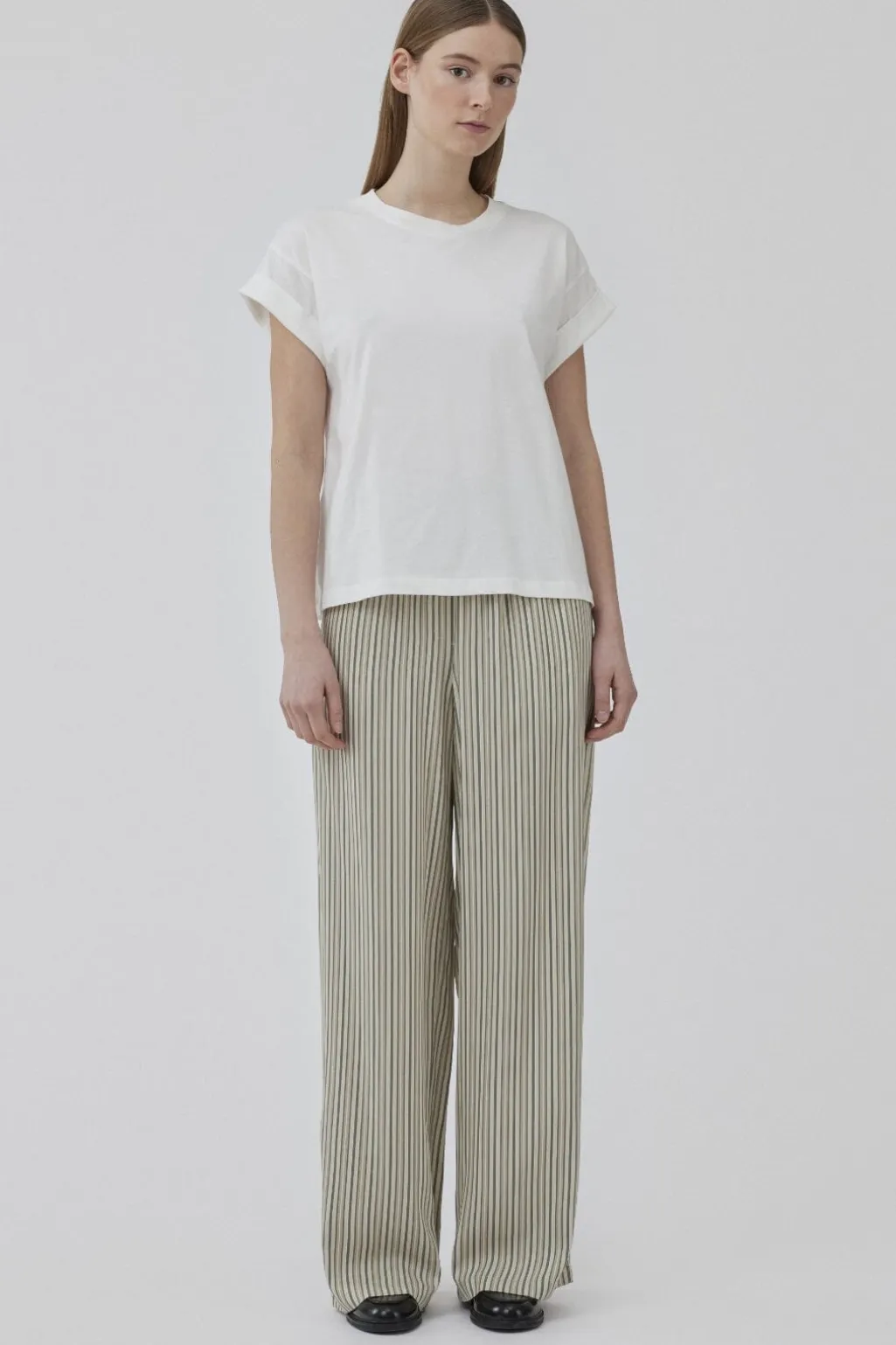 Hvid t-shirt fra Modström med opsmøgede ærmer og rund halsudskæring. T-shirten er fremstillet af økologisk bomuld og har en afslappet pasform.