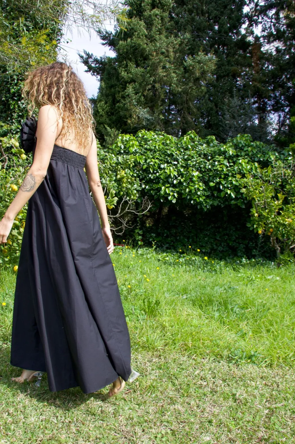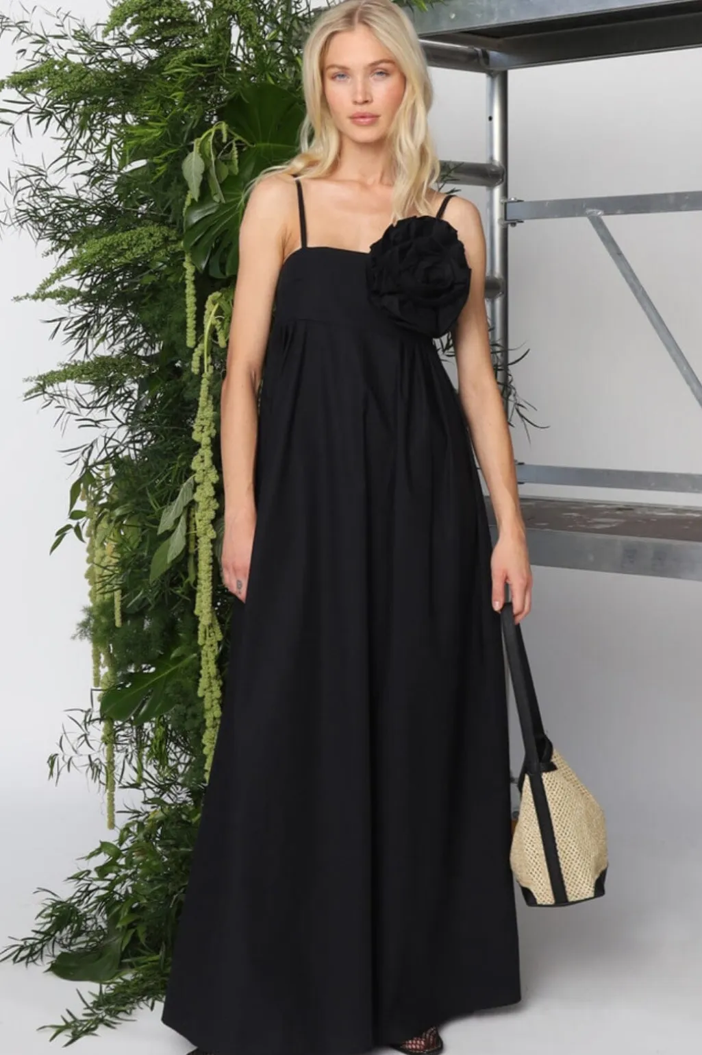Sort festkjole fra Cras med firkantet udskæring og gulvlængde. Kjolen har en stor blomsterdetalje på skulderen og er lavet i et rent bomuldsstof med en draperet silhuet.