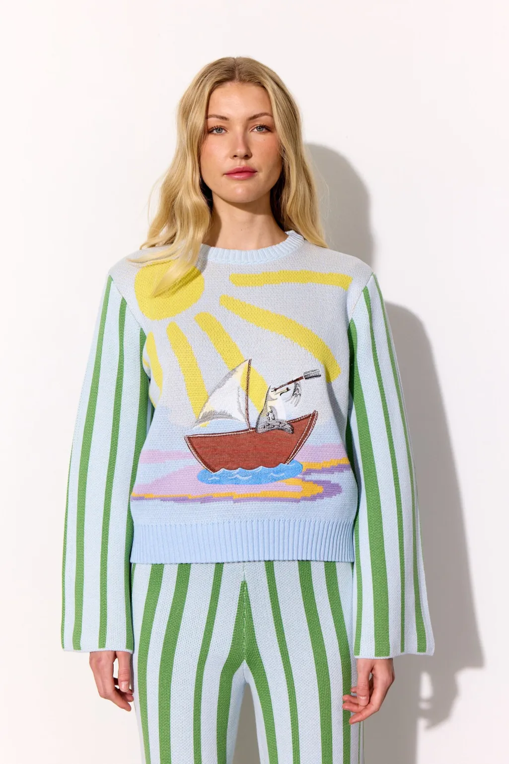 Bluse fra Hunkøn i farven Blue Sea. Den har et broderet motiv med sol og båd på forsiden og vertikale striber på ærmerne.