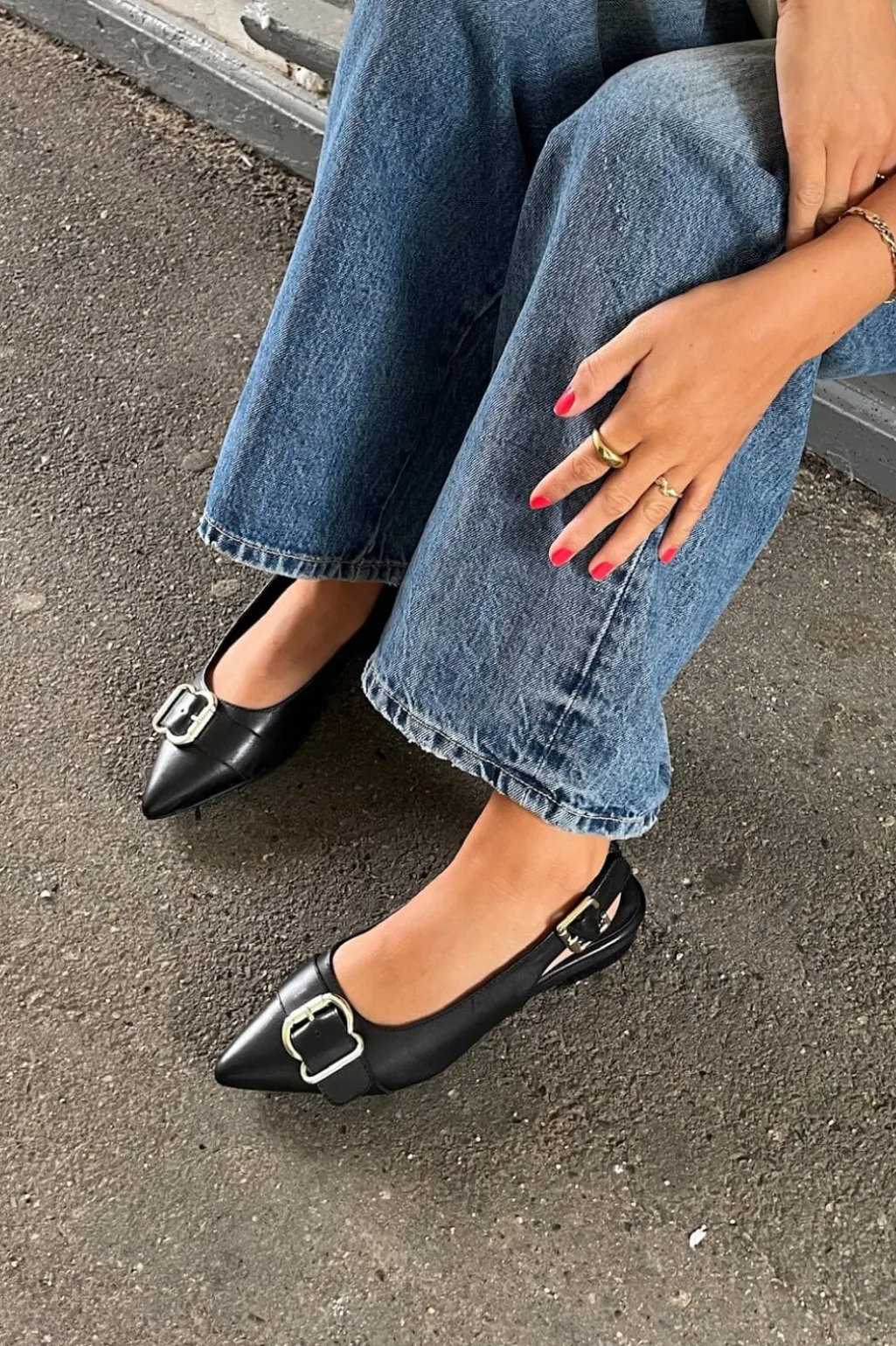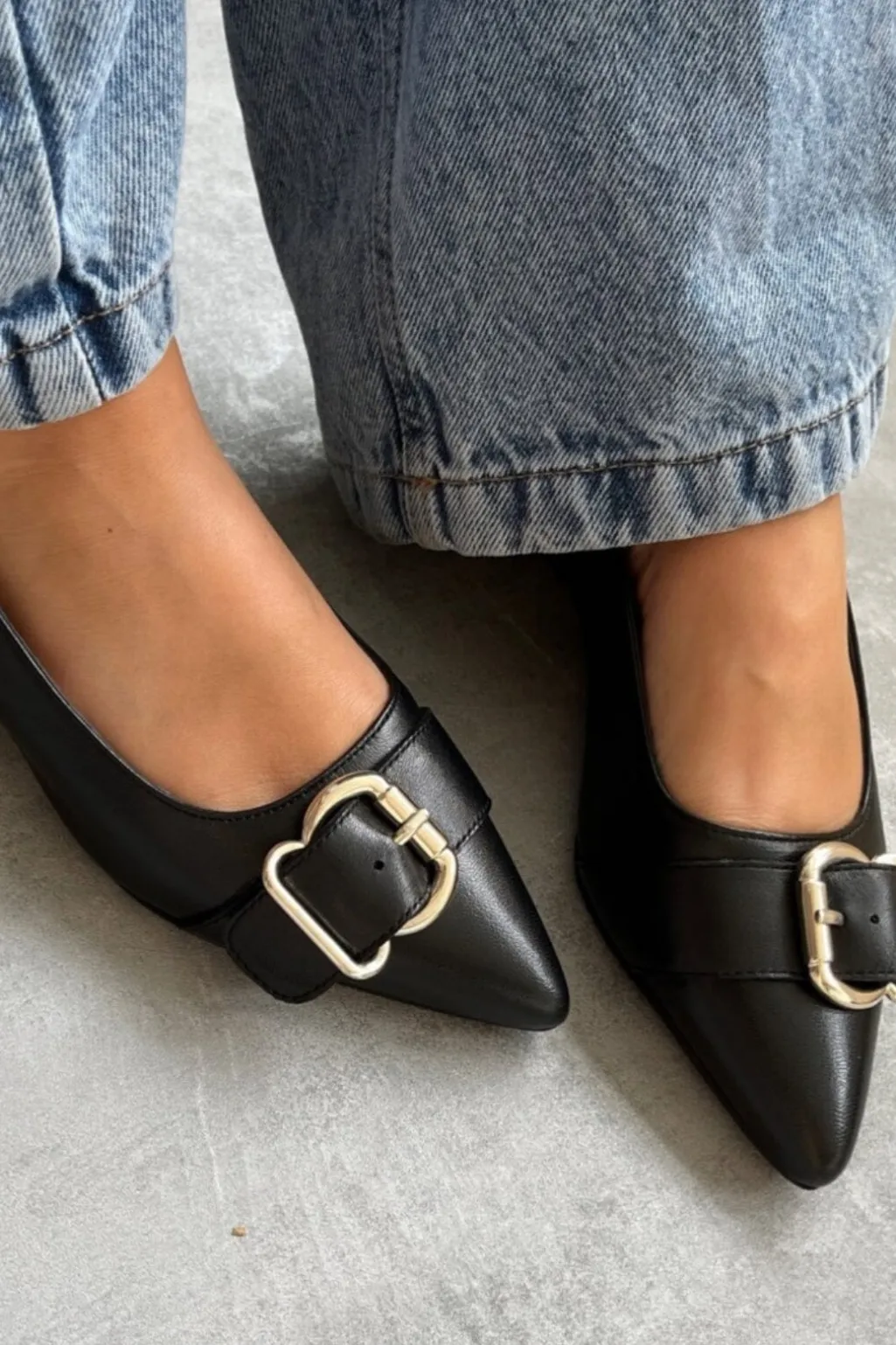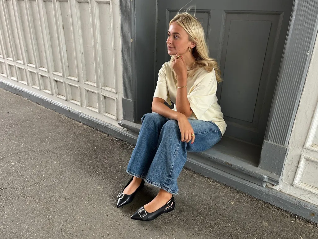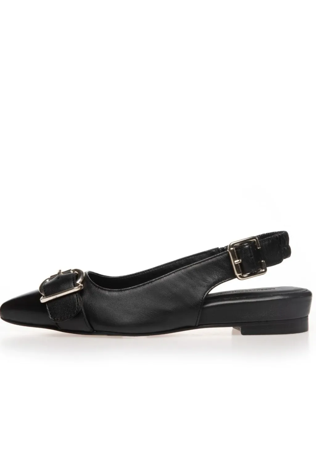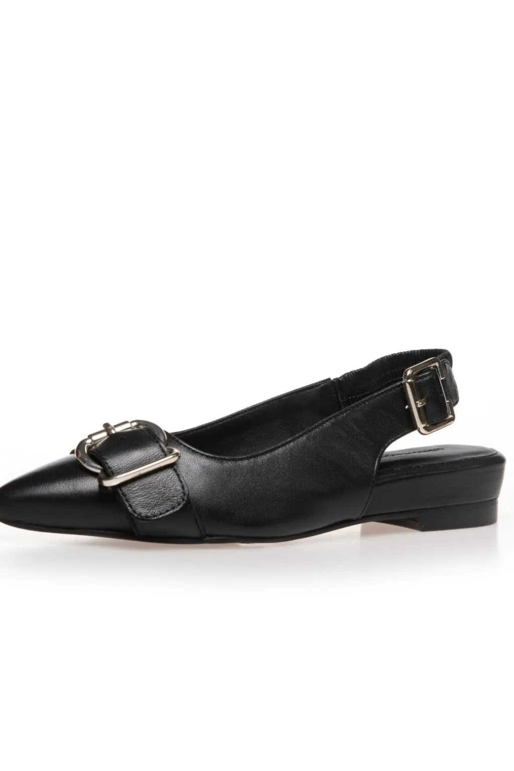 Sorte ballerinaer fra Copenhagen Shoes i læder med spids tå. Skoene har en dekorativ spænde på forsiden og en lav hæl.