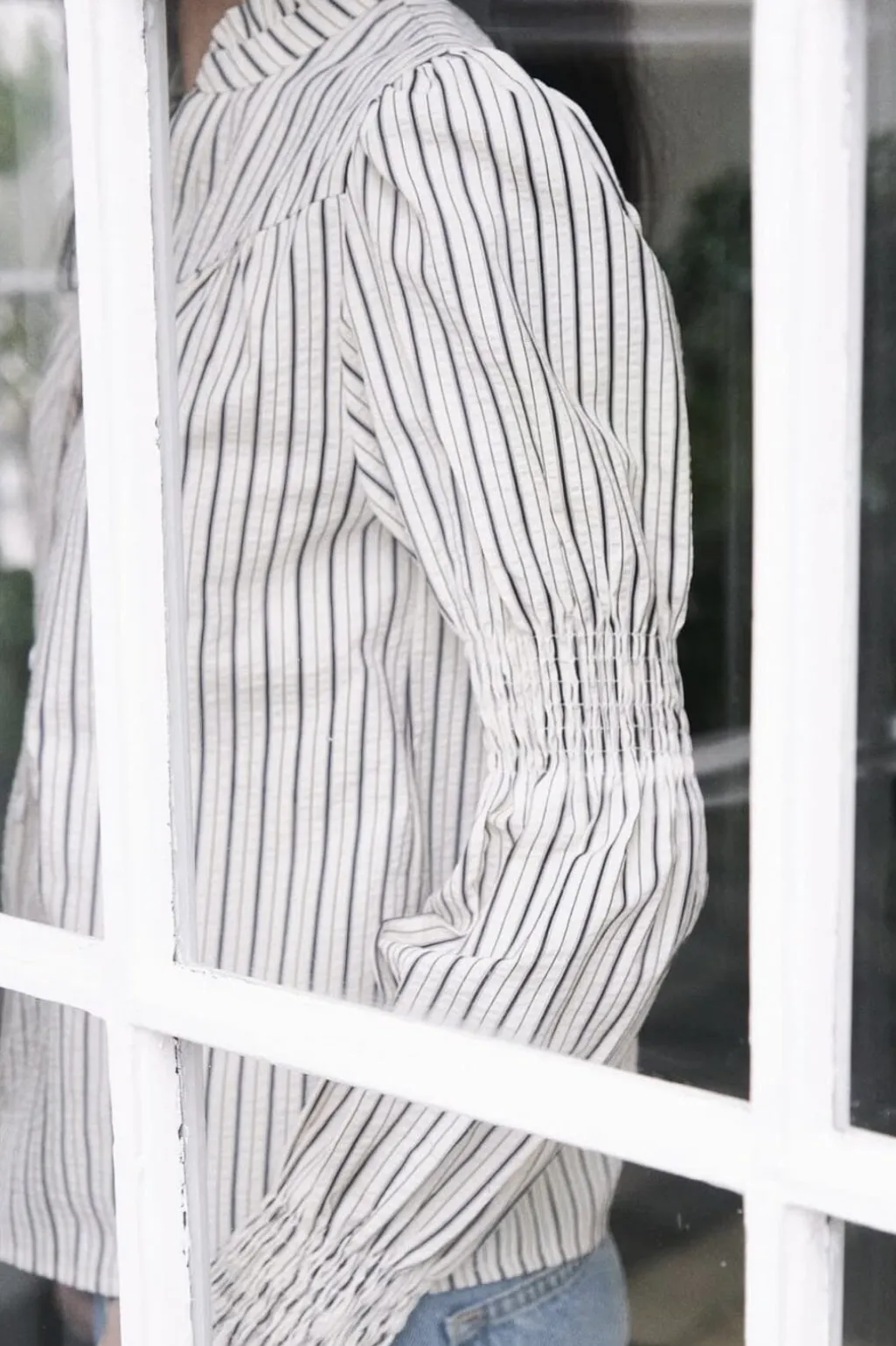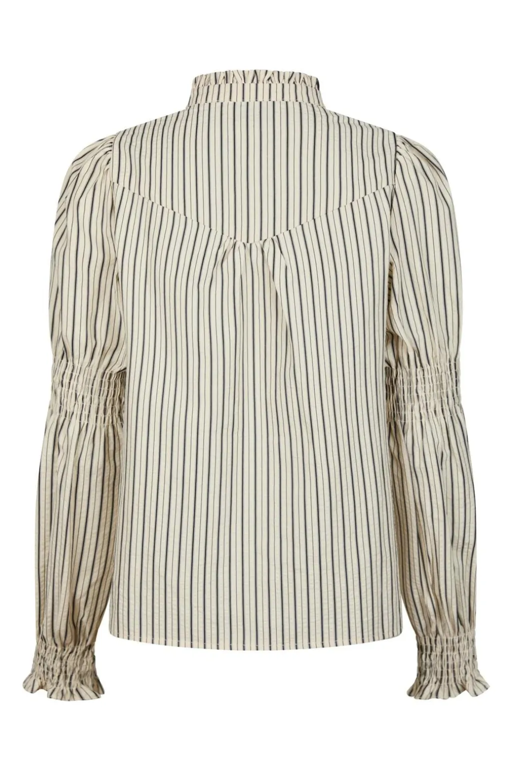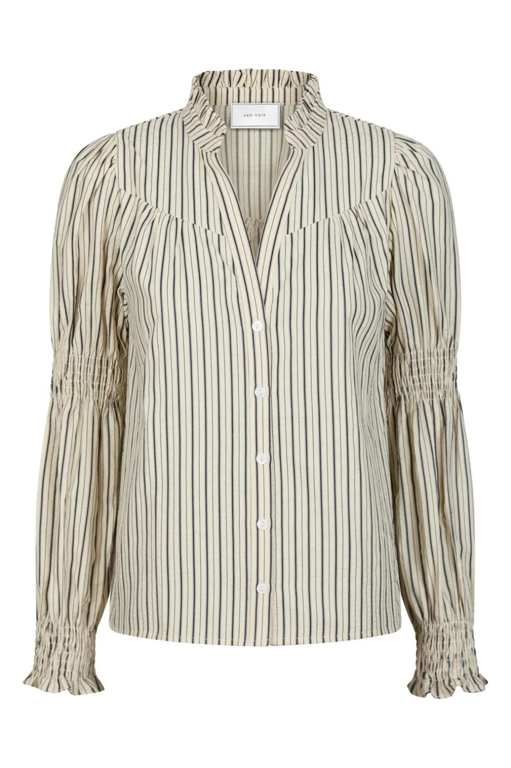 Stribet bluse fra Neo Noir i creme med mørke striber. Blusen har v-hals, lange ærmer med rynkedetaljer og knapper foran. Stoffet er en blanding af polyester og bomuld.