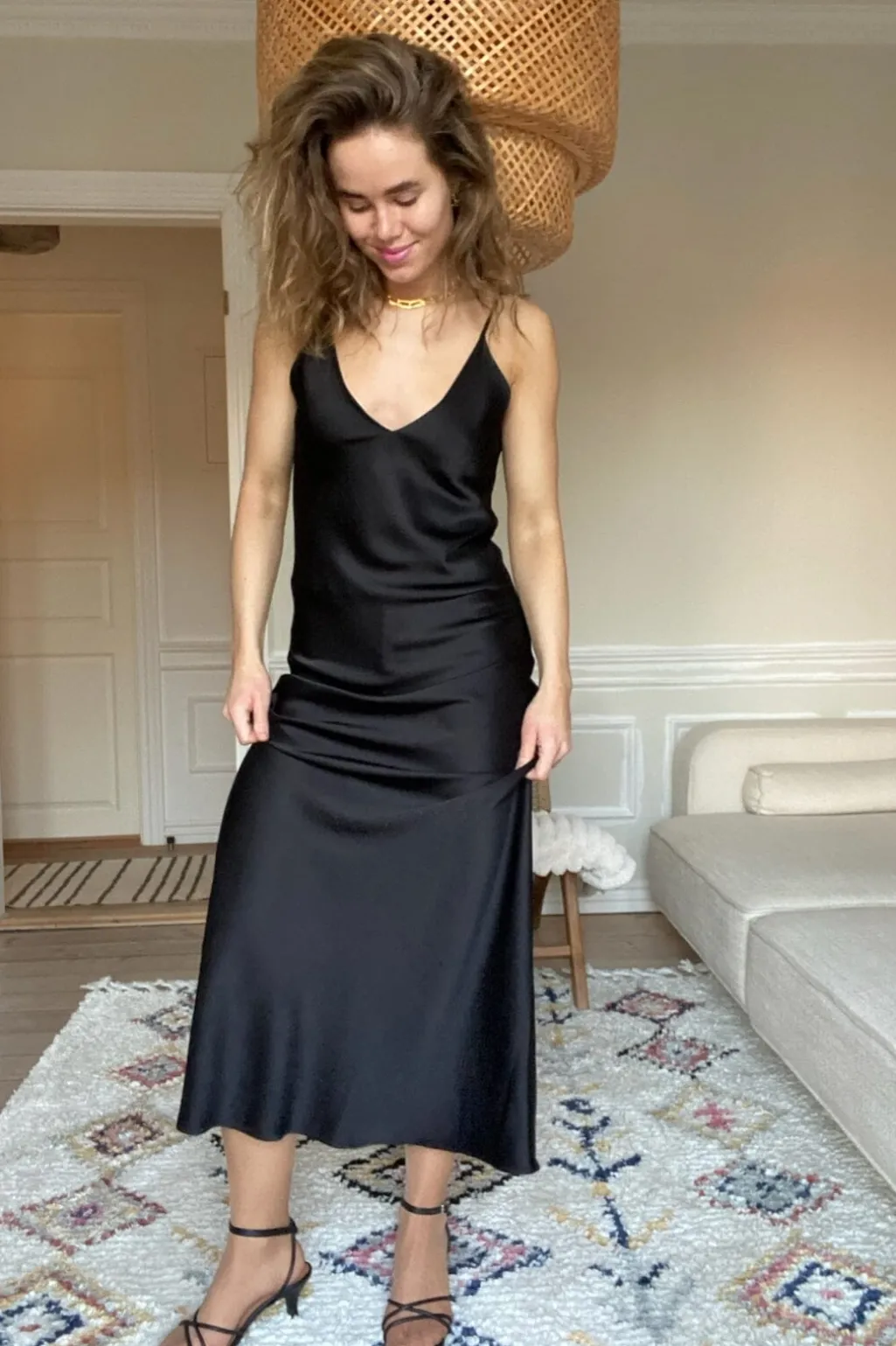 Sort camisolekjole i satinlignende stof med dyb V-udskæring og tynde stropper. Kjolen har en glat overflade med let glans og går til læggene.