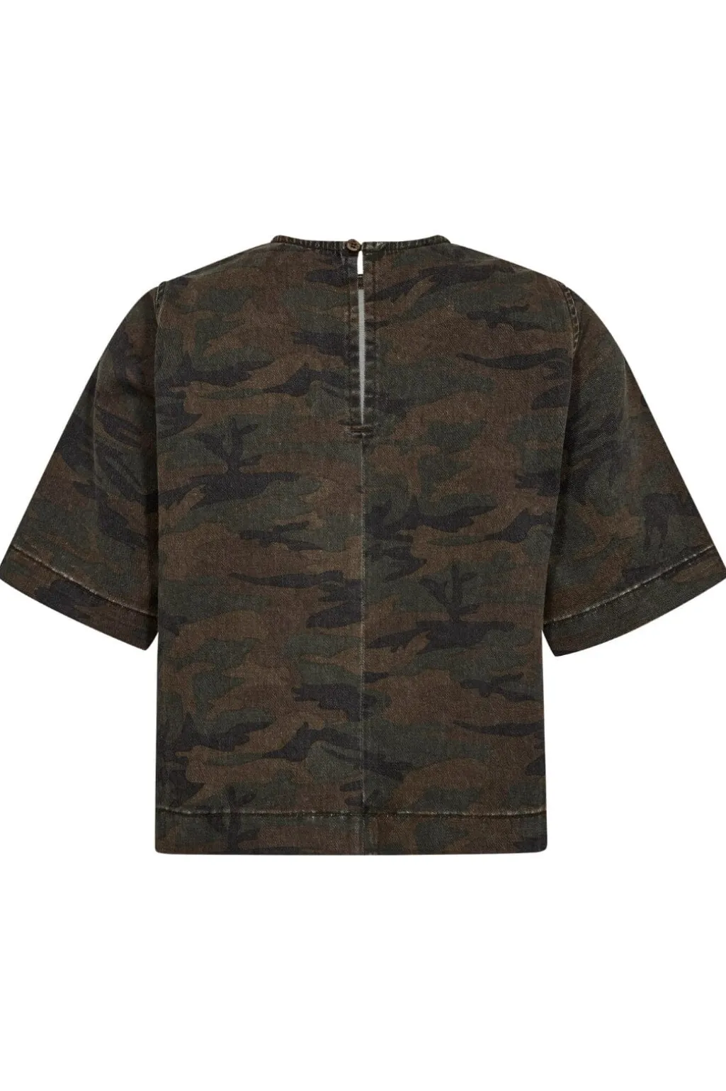 Denimbluse fra Co´Couture med camouflageprint i grøn og brun. Blusen har korte ærmer og rund halsudskæring, hvilket giver et enkelt og praktisk design.