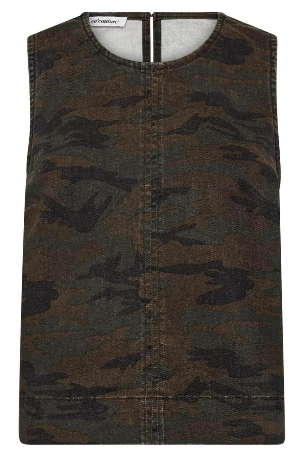 Ærmeløs denimtop med camouflageprint i grønne og brune nuancer. Den har rund halsudskæring og knaplukning ved nakken. Toppen er lavet i et blødt bomuldsmix med stretch.