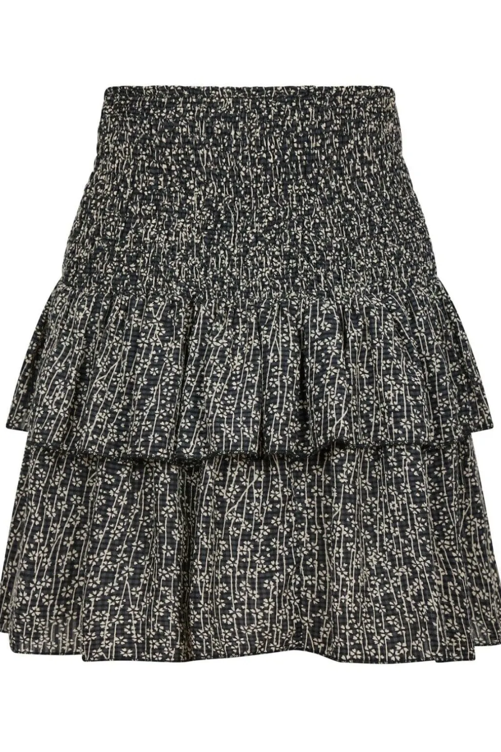 Sort nederdel fra Neo Noir med blomster- og ternet mønster. Den smockede talje og volanger i lag skaber en let og bevægelig silhuet.