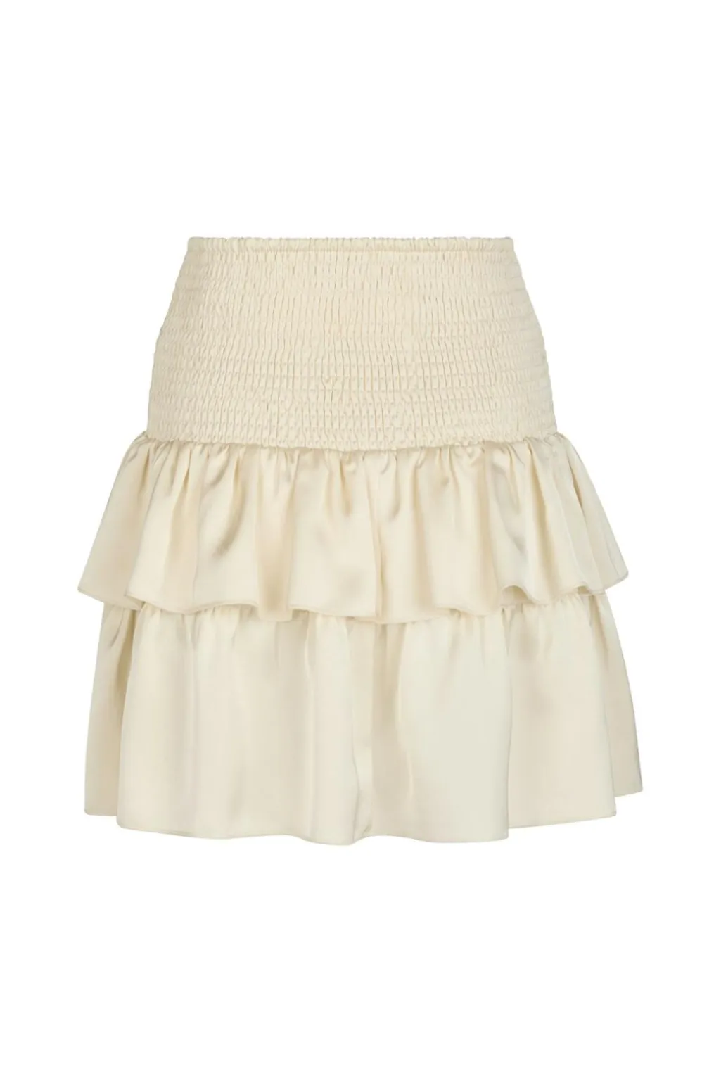 Kort nederdel fra Neo Noir i perlefarvet sateen. Nederdelen har smock-elastik i taljen og to lag flæser, der giver bevægelse til designet.