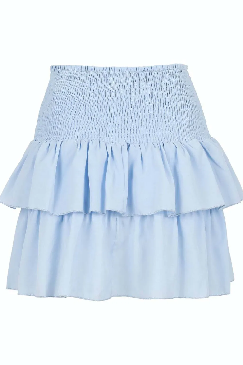 Lyseblå nederdel fra Neo Noir med rynket elastisk talje og dobbelte flæser. Den er fremstillet af genanvendt polyester og har en høj talje med lårlang pasform.