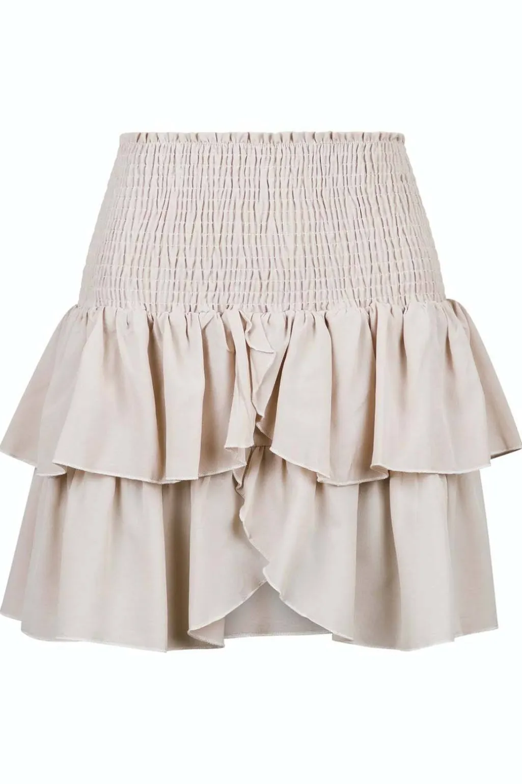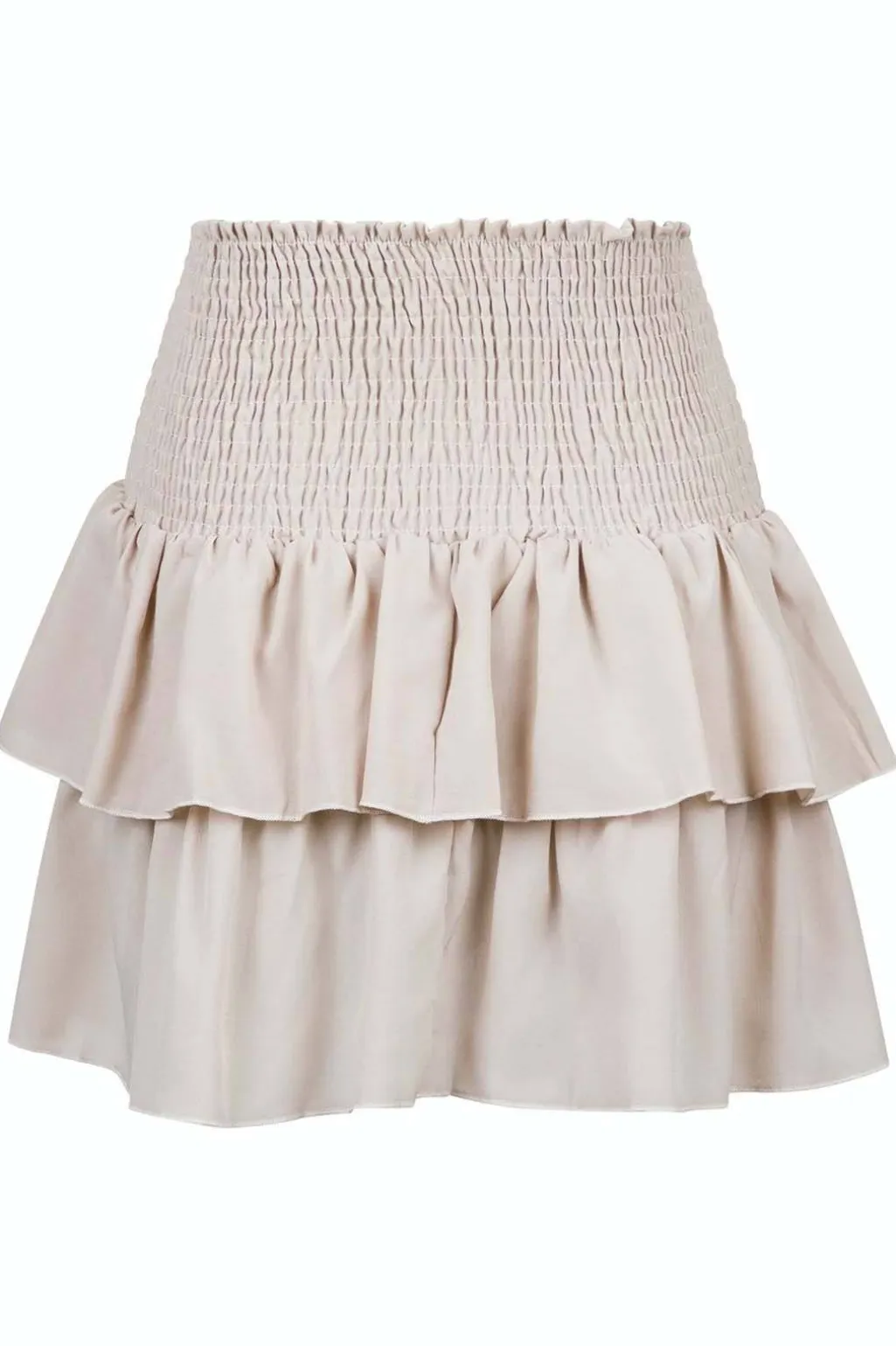 Sandfarvet nederdel fra Neo Noir med smock-detalje i taljen. Den har to lag flæser og er fremstillet i et let materiale med elastik i taljen.