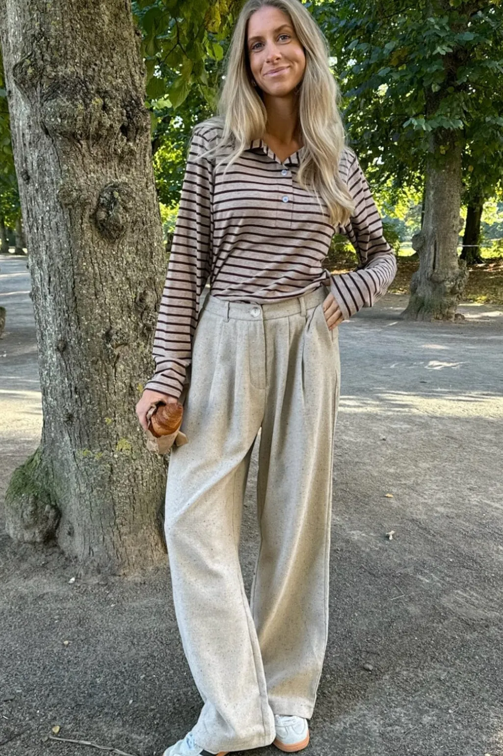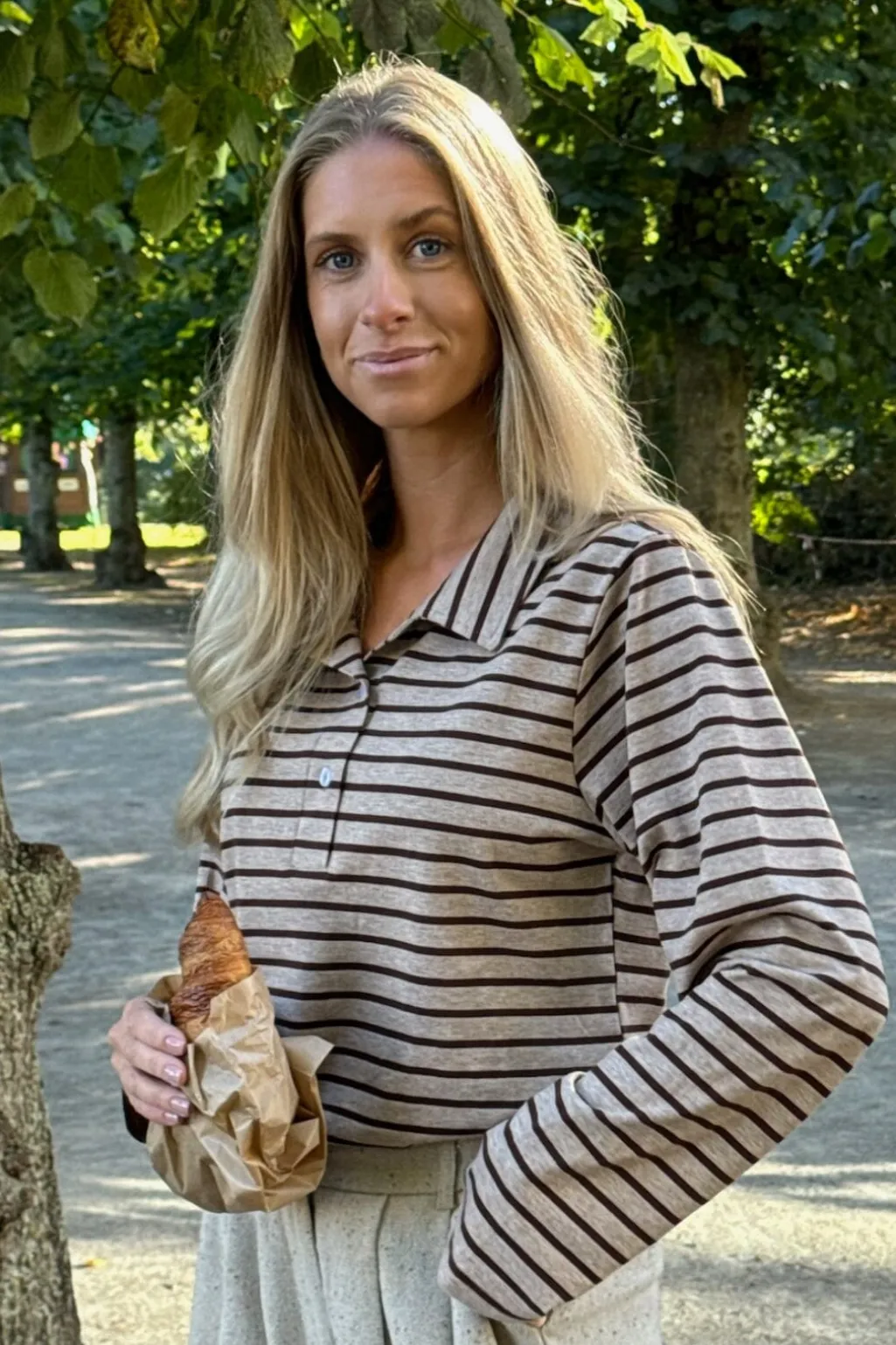 Stribet polo fra BYIC i beige og brun. Den har en polokrave i hvid og tre knapper foran. De lange ærmer har matchende hvide manchetter.