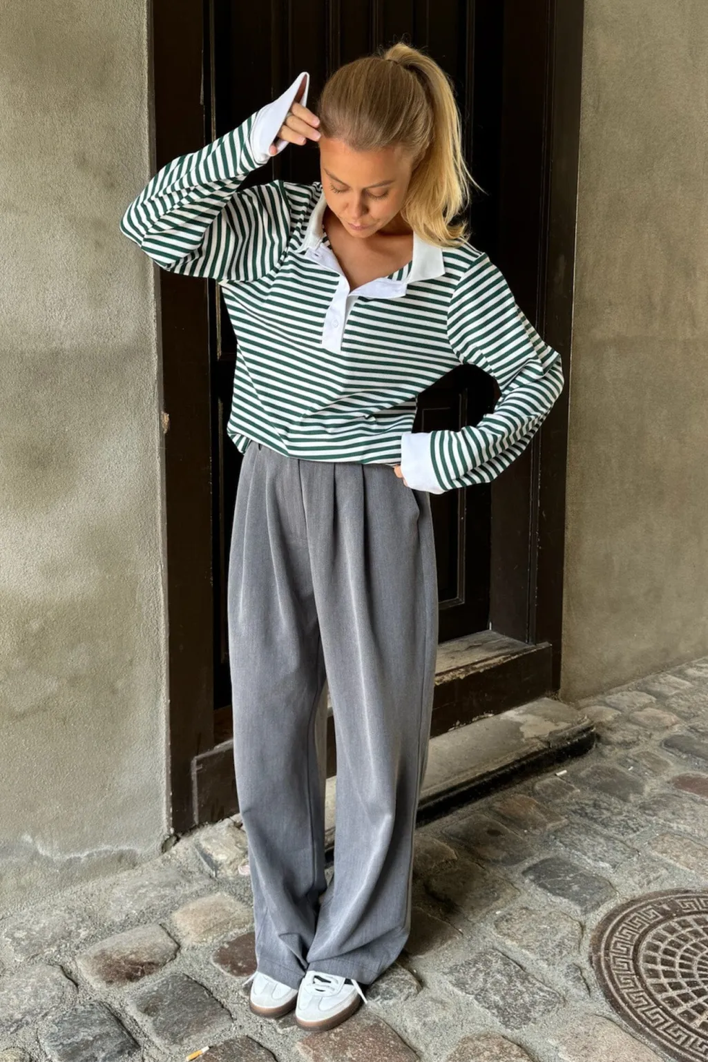 Stribet polo fra BYIC med grønne og hvide striber. Den har en klassisk polokrave og lange ærmer med flæsedetaljer, der giver et maritimt præg til designet.