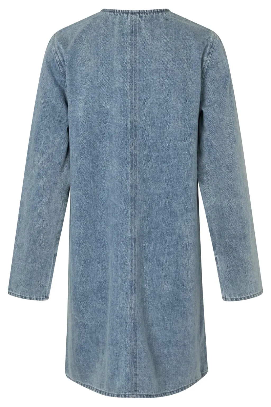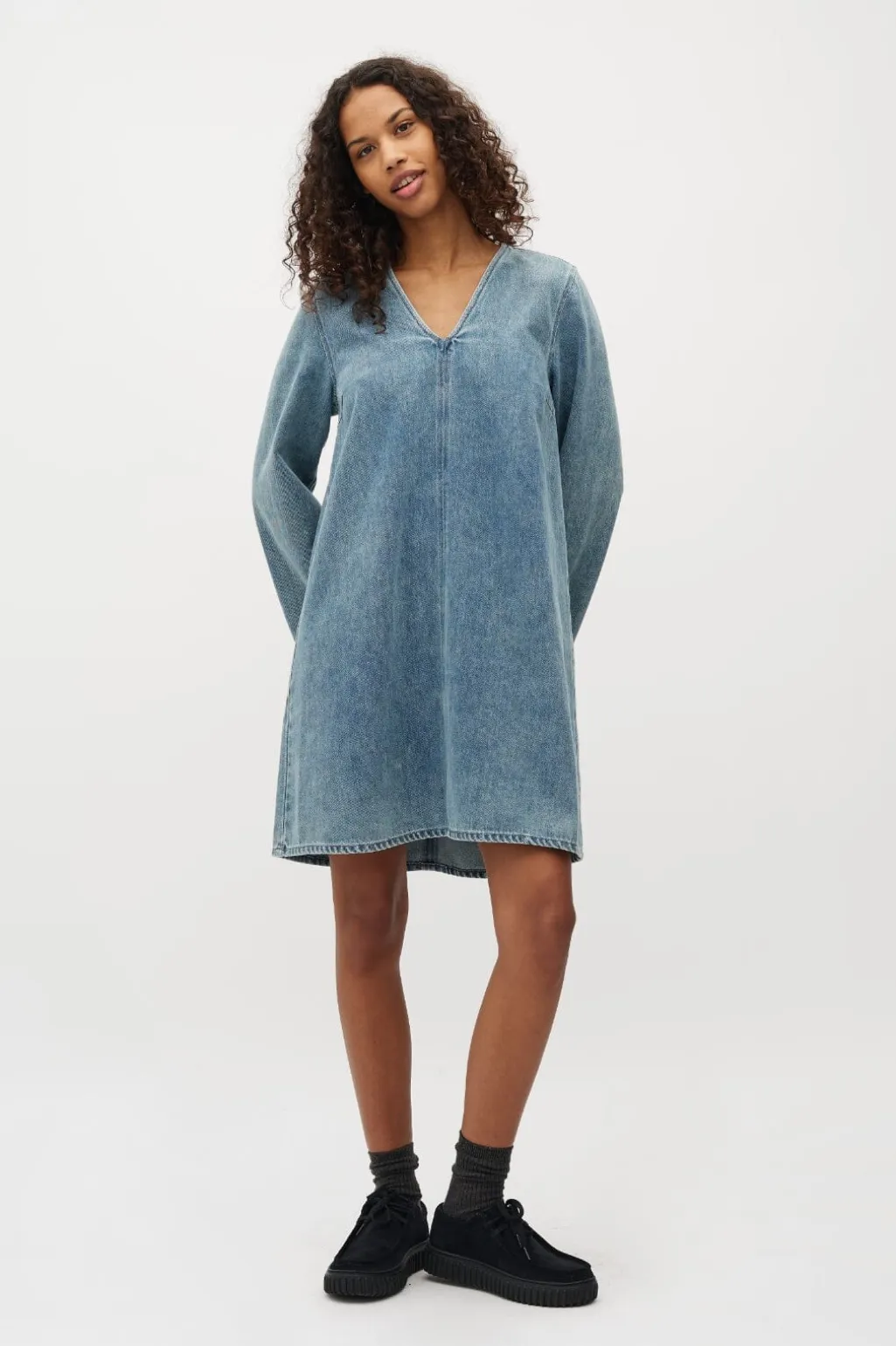 En blå kjole fra MbyM med en soft wash-effekt. Den har v-udskæring, lange ærmer og en længde til midt på låret.