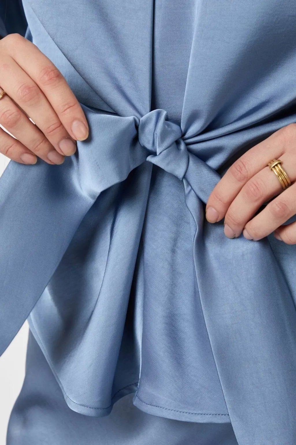 Bluse fra Neo Noir i røgblå, tung satinkvalitet. Den har korte ærmer, V-hals og en justerbar knude foran, der giver mulighed for at tilpasse pasformen.