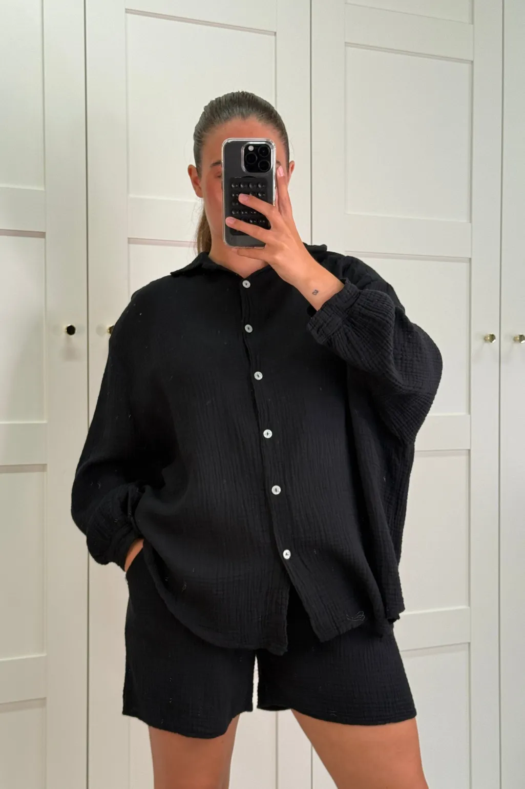 Sort sæt fra A-bee i to dele med skjorte og shorts. Fremstillet i ren bomuld med knapper foran på skjorten og snøre i shortsene. Sættet har en afslappet pasform.