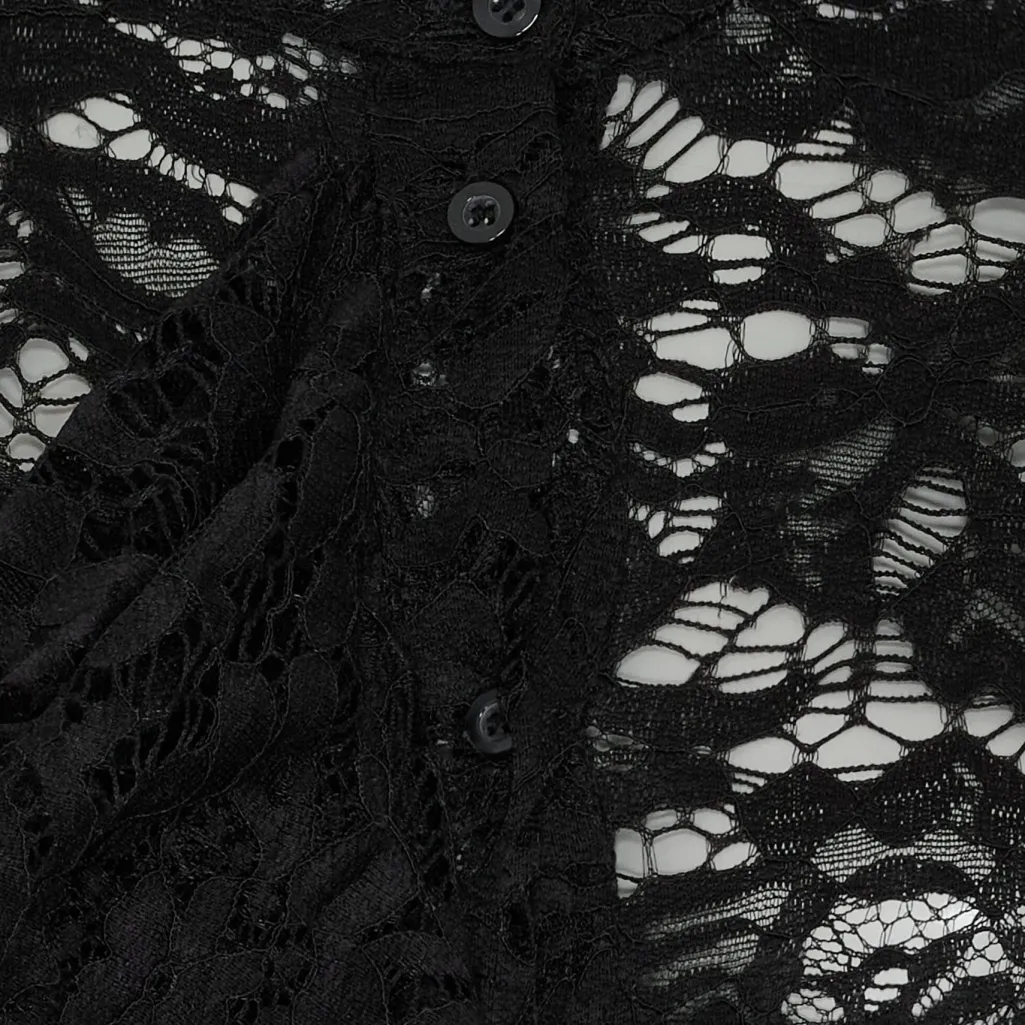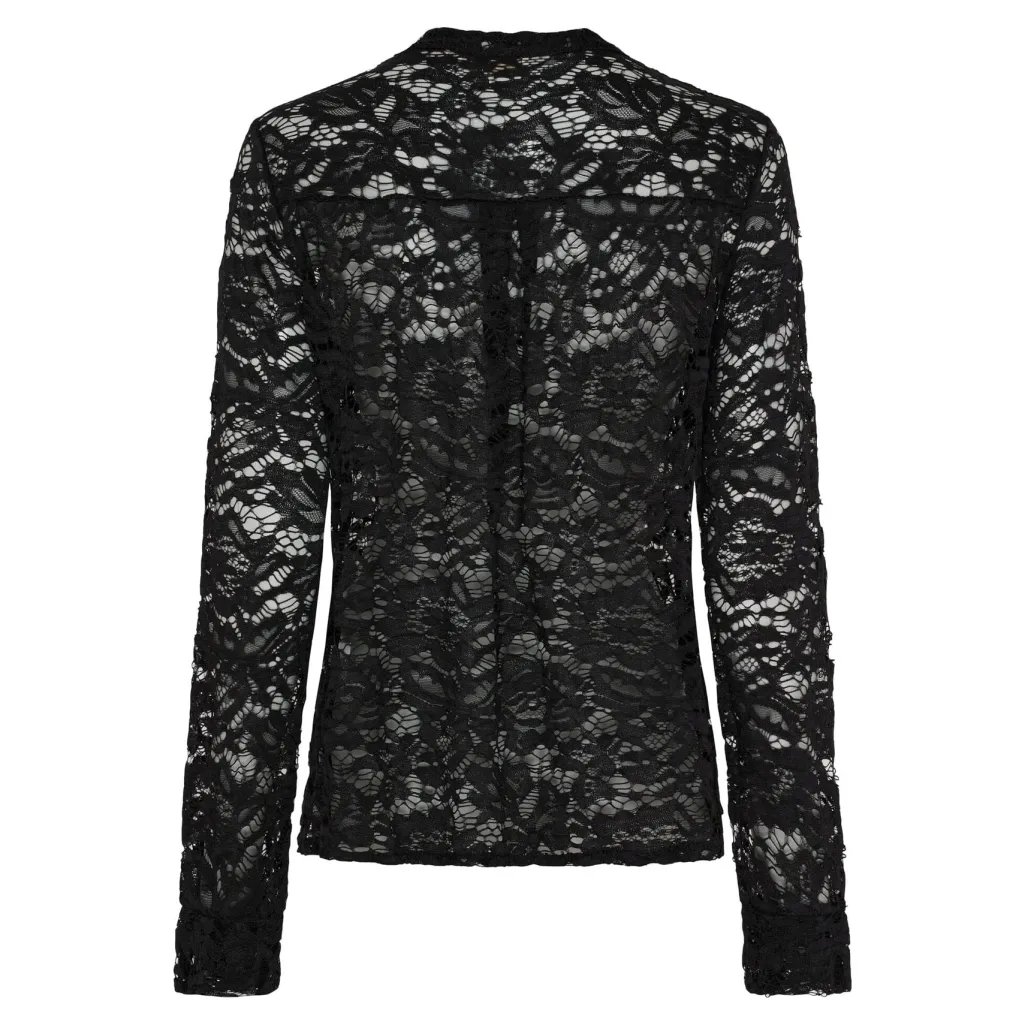 Sort blondeskjorte fra Marta Du Chateau med lange ærmer og skjortekrave. Skjorten har et gennemgående blomstermønster i blonden og rucher langs fronten.