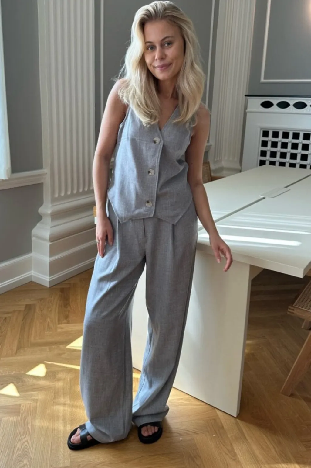 Grå bukser fra BYIC med vidt snit og skræddersyet design. Bukserne har en løs pasform og høj funktionalitet med både for- og baglommer. De kan styles med den matchende Celina-vest.
