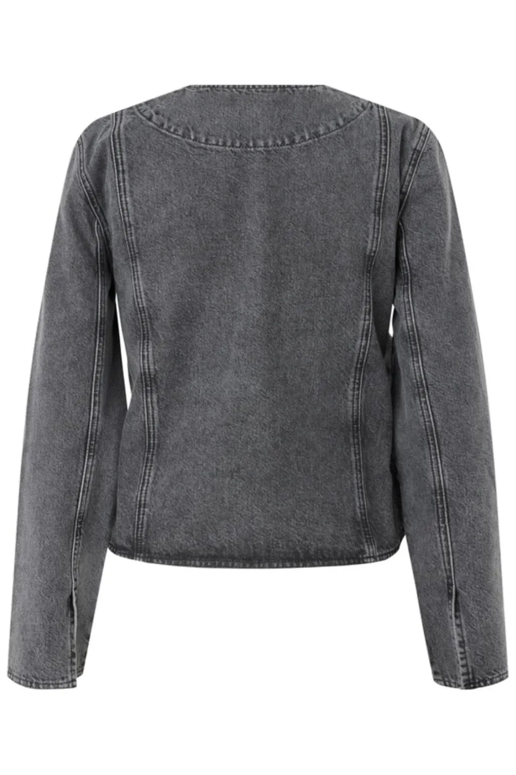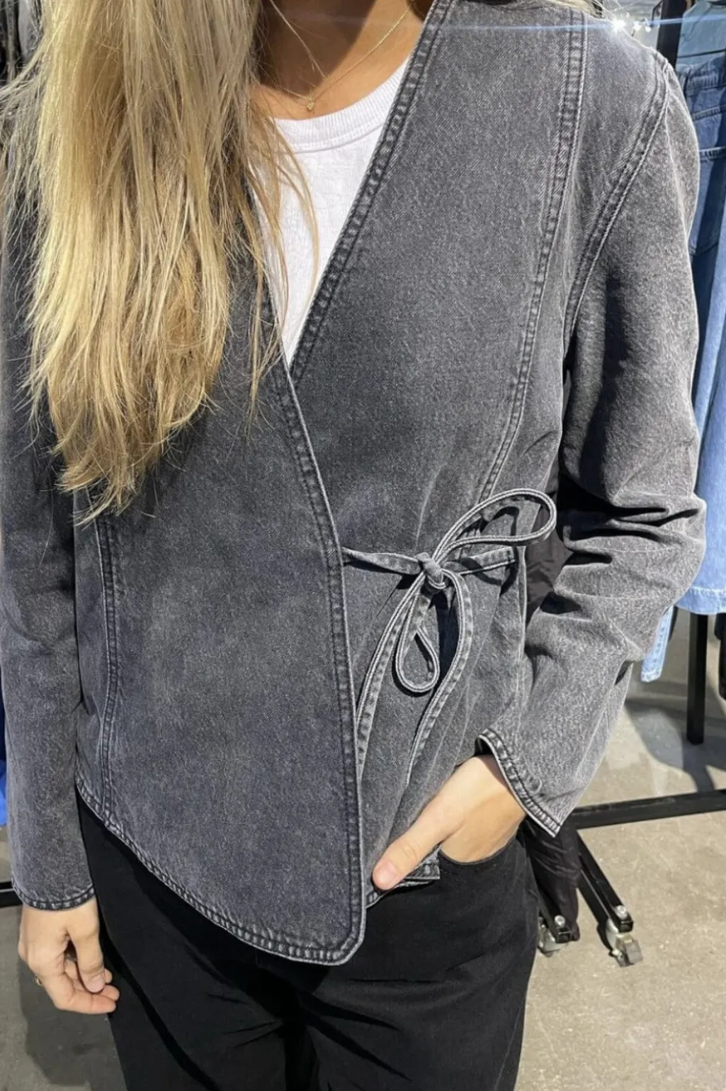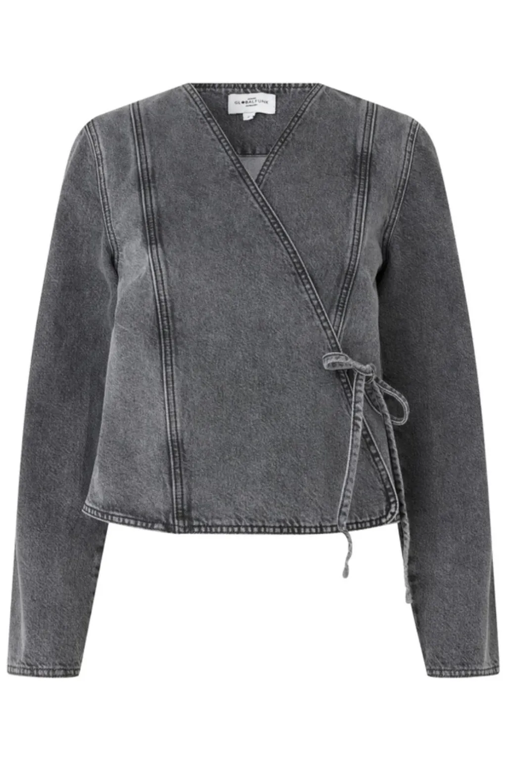 Grå omslagsjakke fra Global Funk med acid wash-effekt. Jakken har V-udskæring og bindebånd i taljen, der giver mulighed for at justere pasformen.