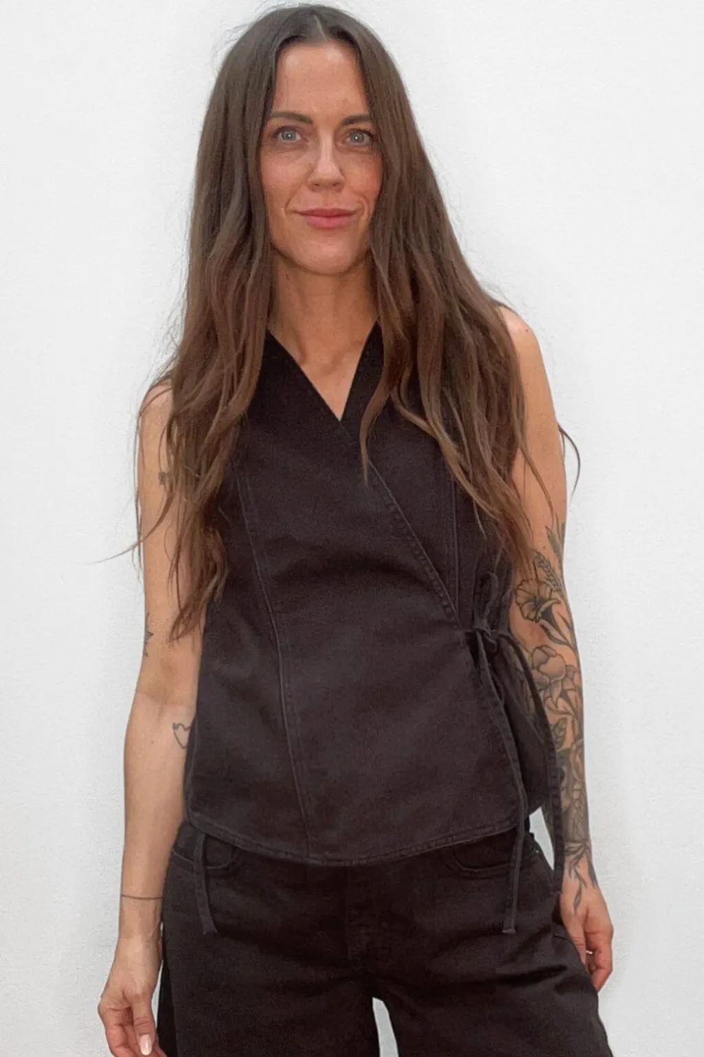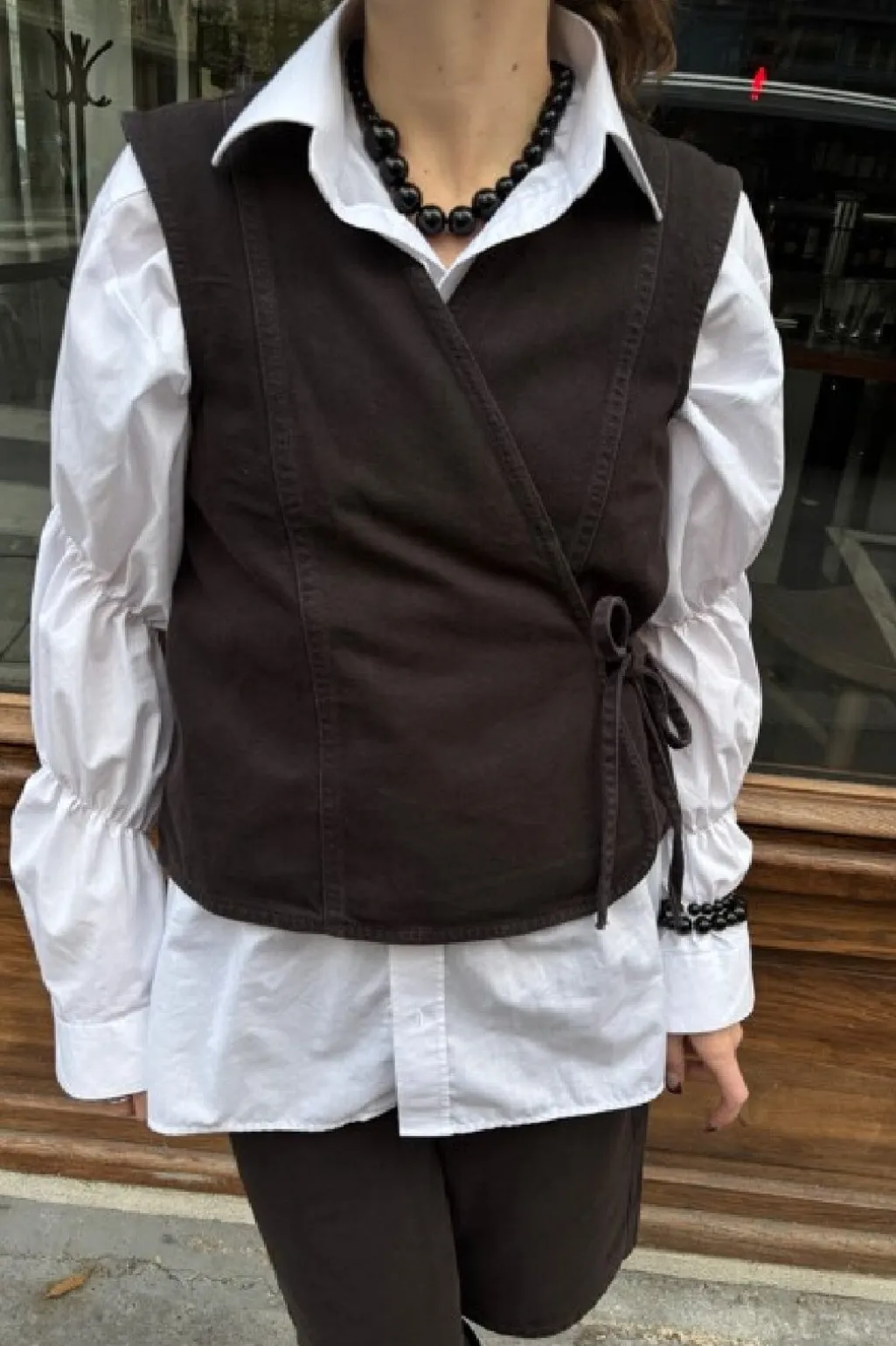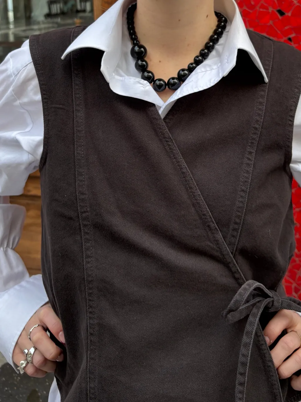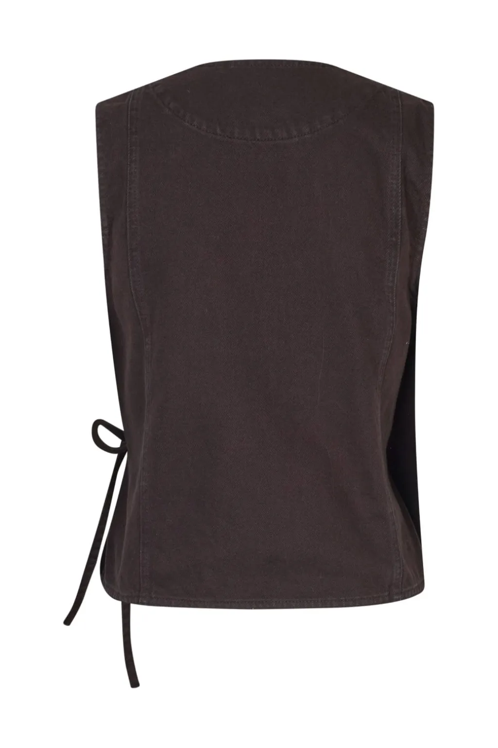 Ærmeløs vest fra Global Funk i en dyb espressobrun farve. Den har en løs pasform med wrap-design og skjortekrave. Bindebåndet i siden giver mulighed for at justere vesten.