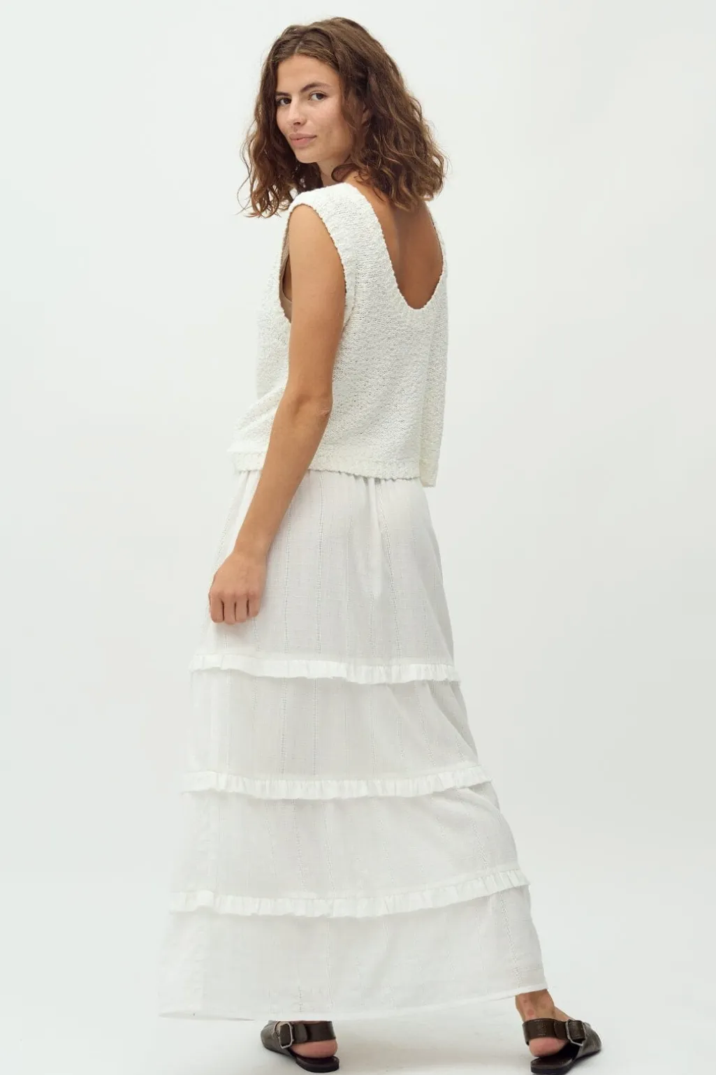 Hvid nederdel fra MbyM med tre vandrette flæser. Skørtet har en regulær talje med snøre og går til anklerne. De bløde lag giver bevægelse i stoffet.